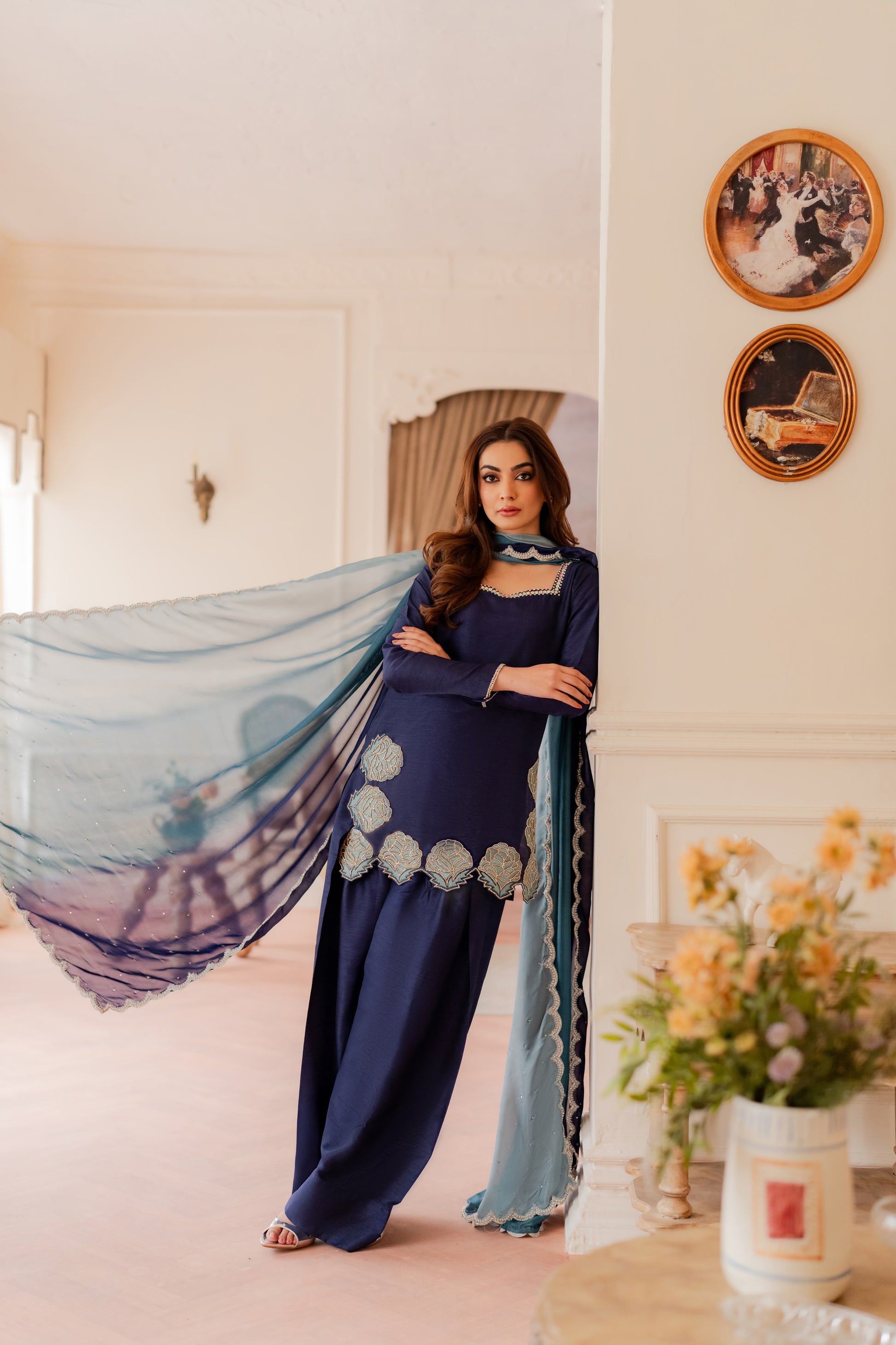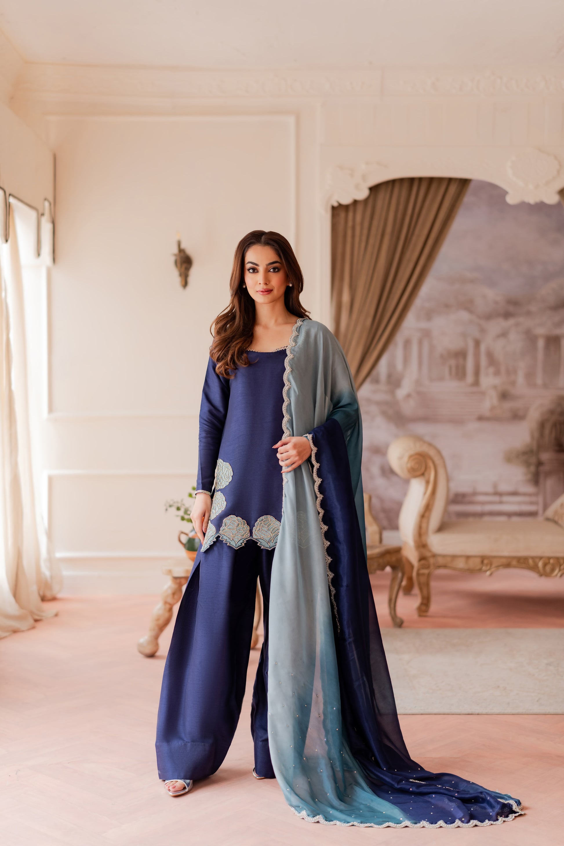 Blue, bold, and breathtaking- “Aqua” features hand-embellished silver stones, a flattering neckline, and a flowing silk dupatta in dreamy blues - Aqua is your statement piece this Eid.