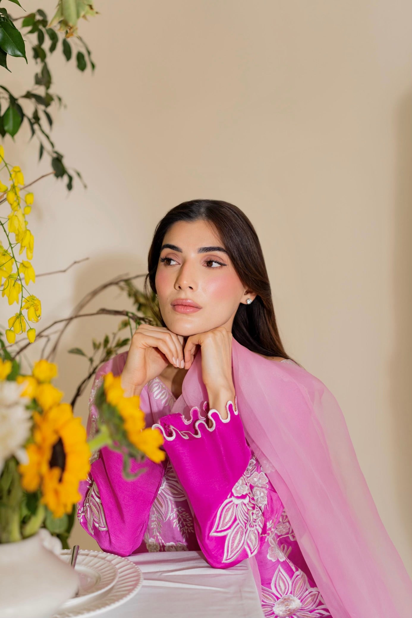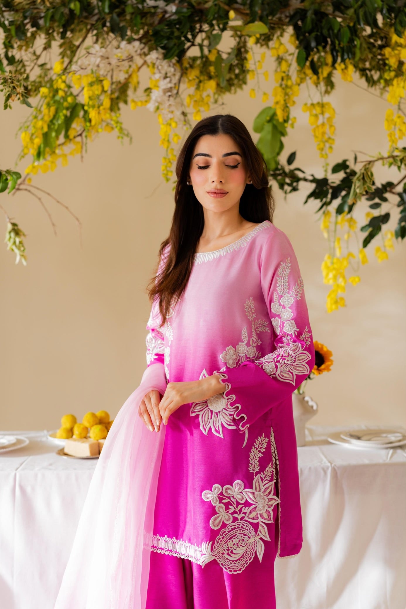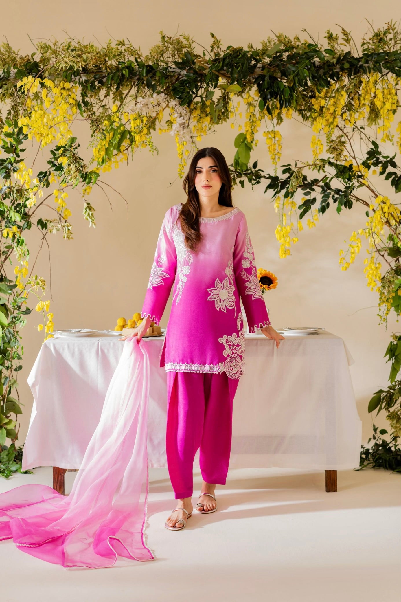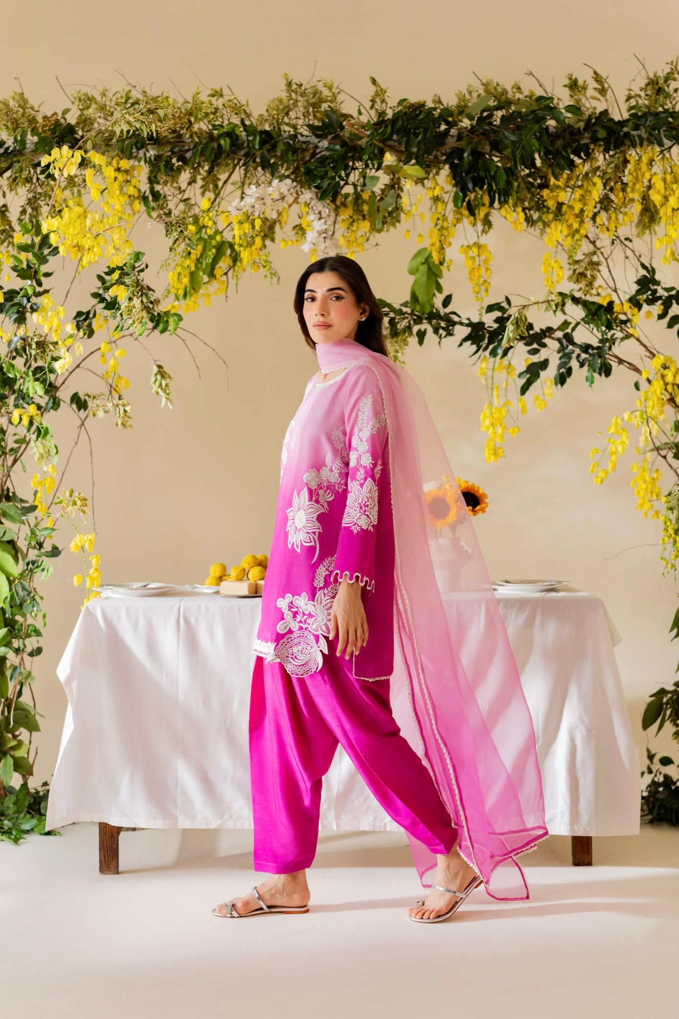 Presenting “Cotton Candy”- pretty, playful and all things pink! A two toned ombre ensemble layered with embroidery all over in the softest candy pink hues paired with a skinny shalwar and a matching two toned organza duppatta, “Candy Pink” is the dreamiest pick of season.