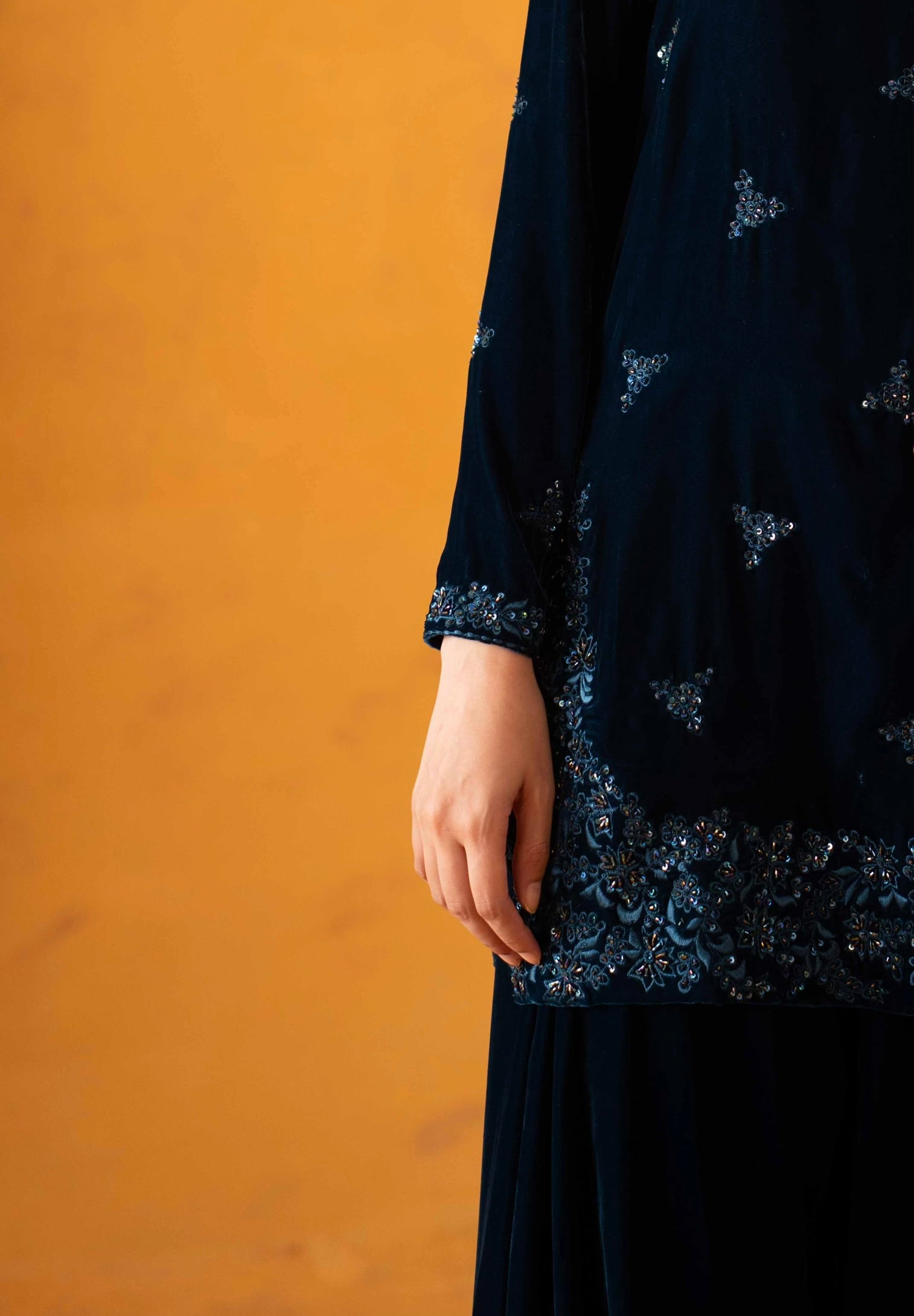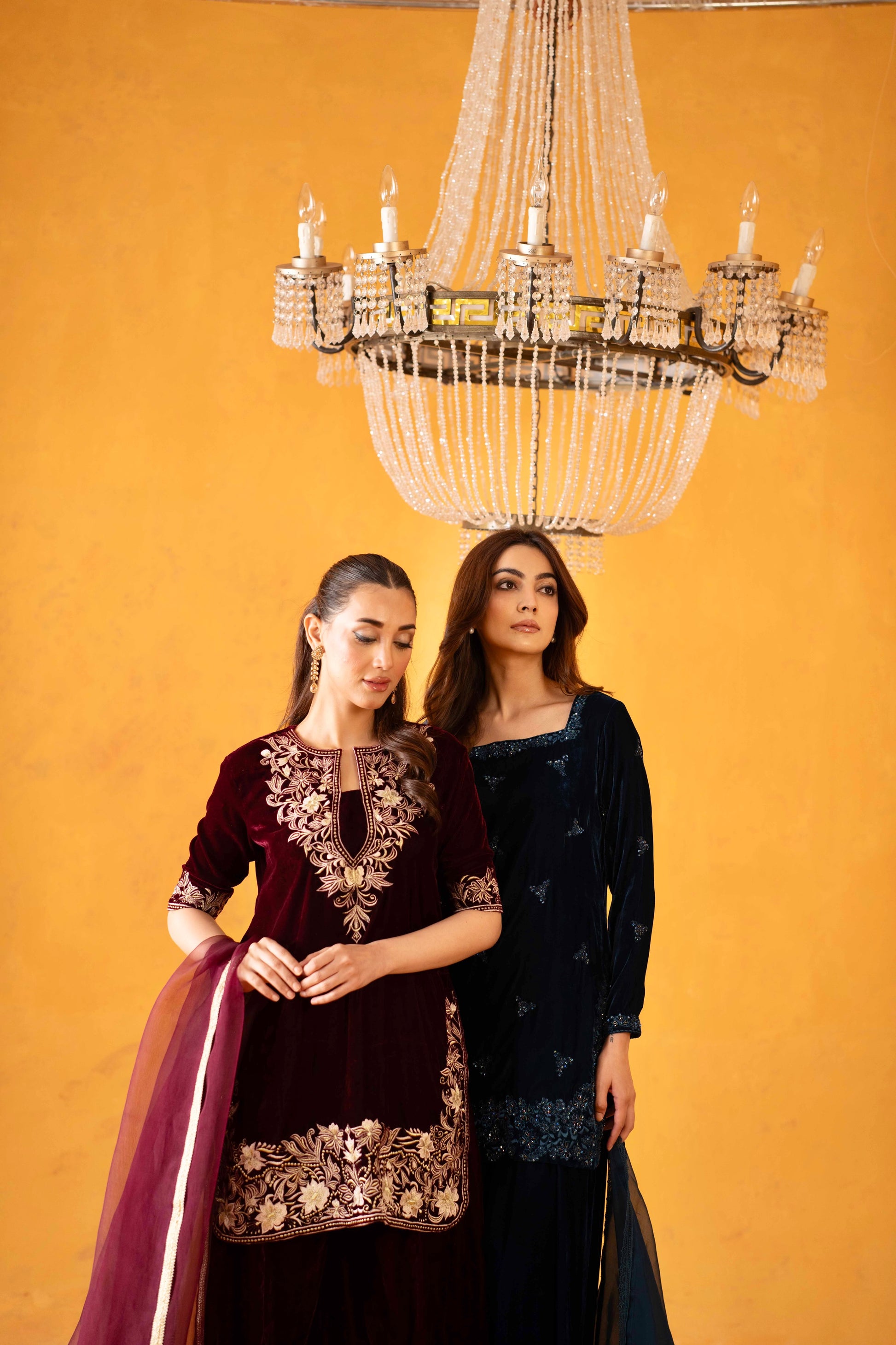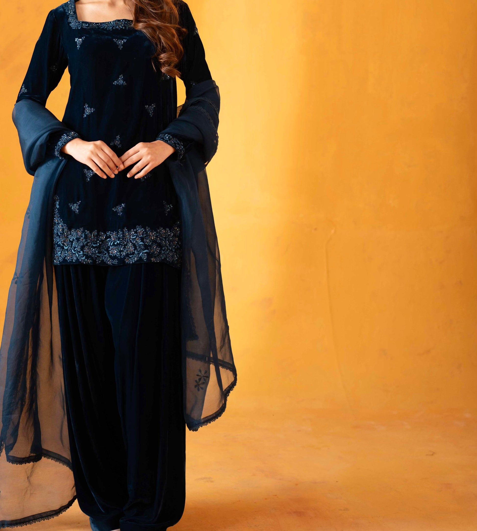 Elle — the festive showstopper you’ve been waiting for. Introducing Elle- a deep shade of teal velvet serves as the base for delicate kat-dana work on the front. A flattering square neckline adorned with the most beautiful work paired with a matching farshi shalwar and pure organza duppatta, Elle is unforgettable and unmatched.