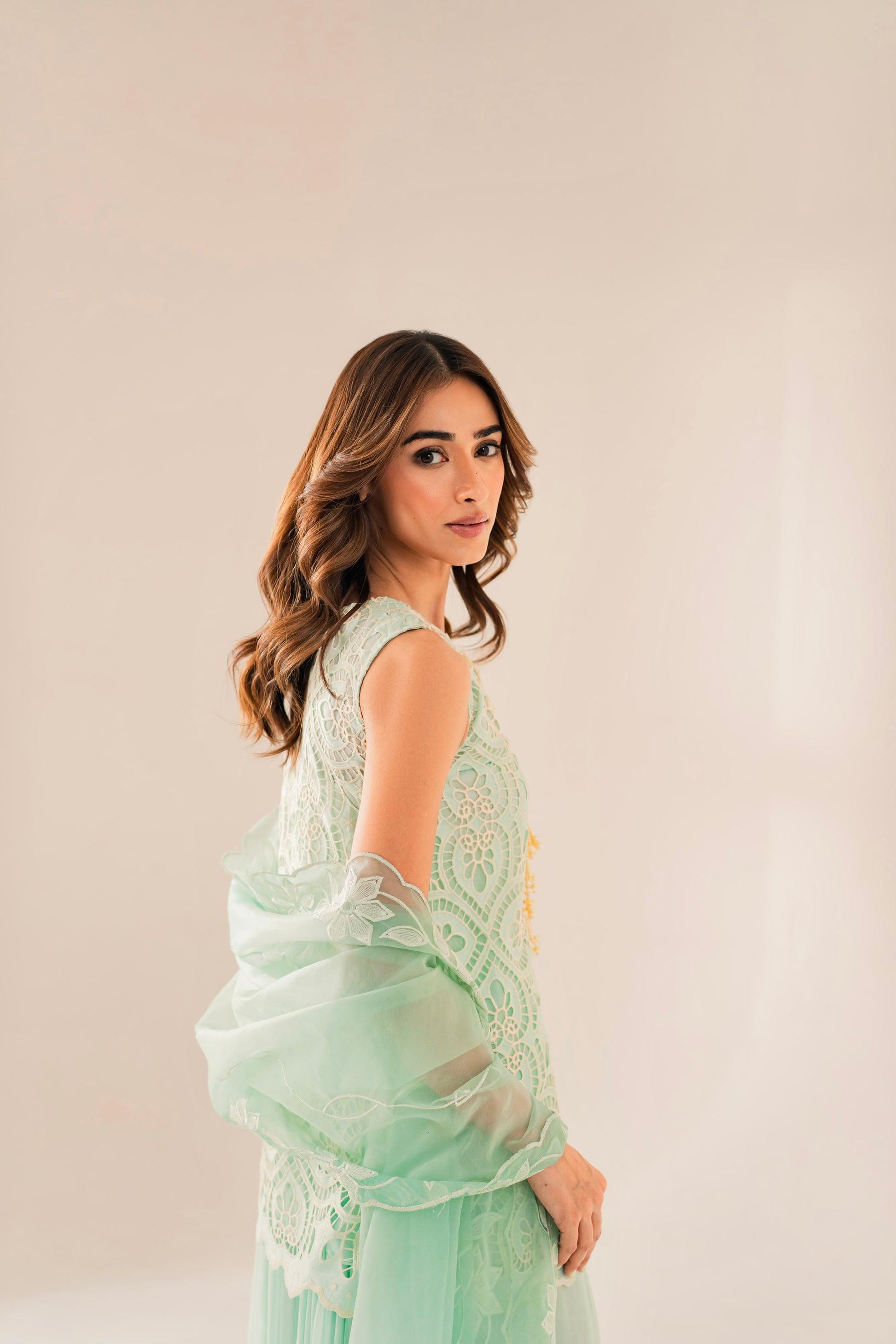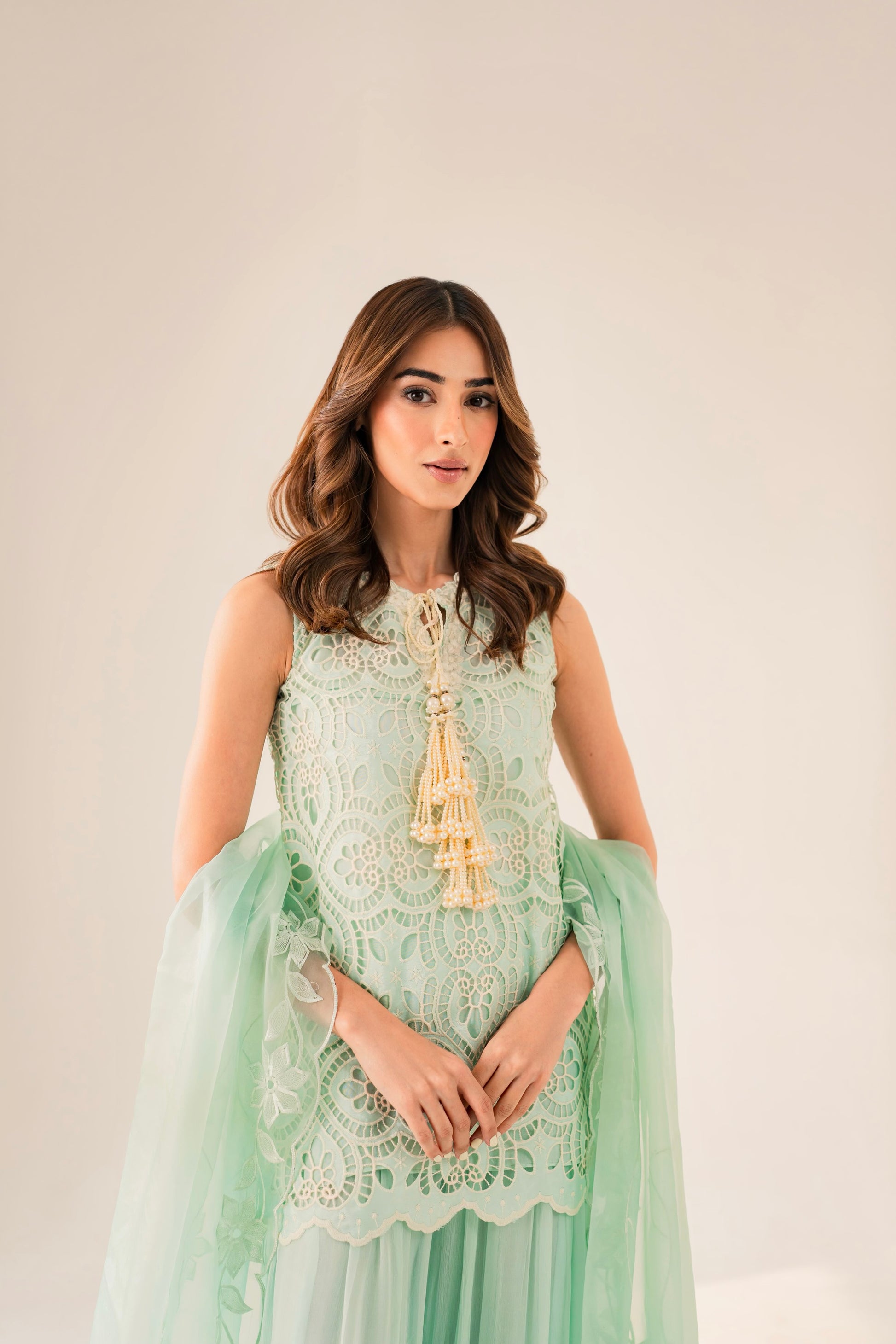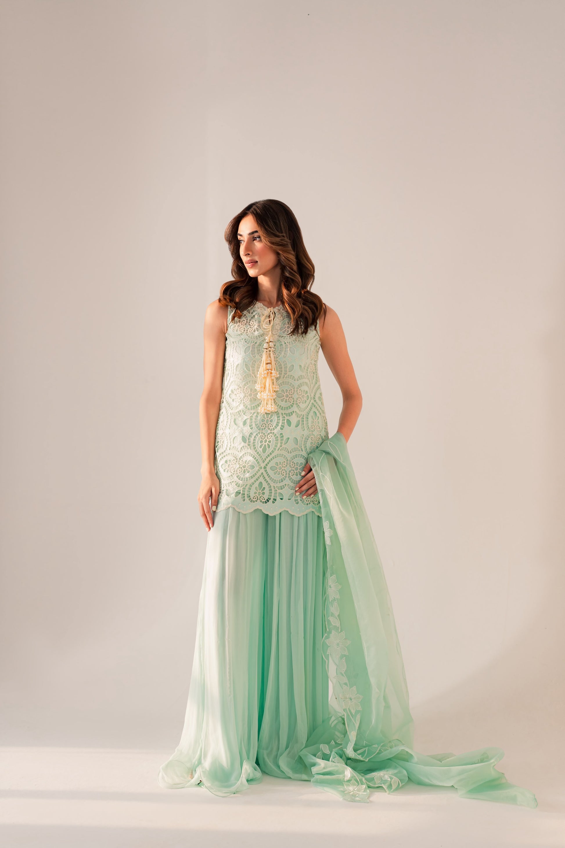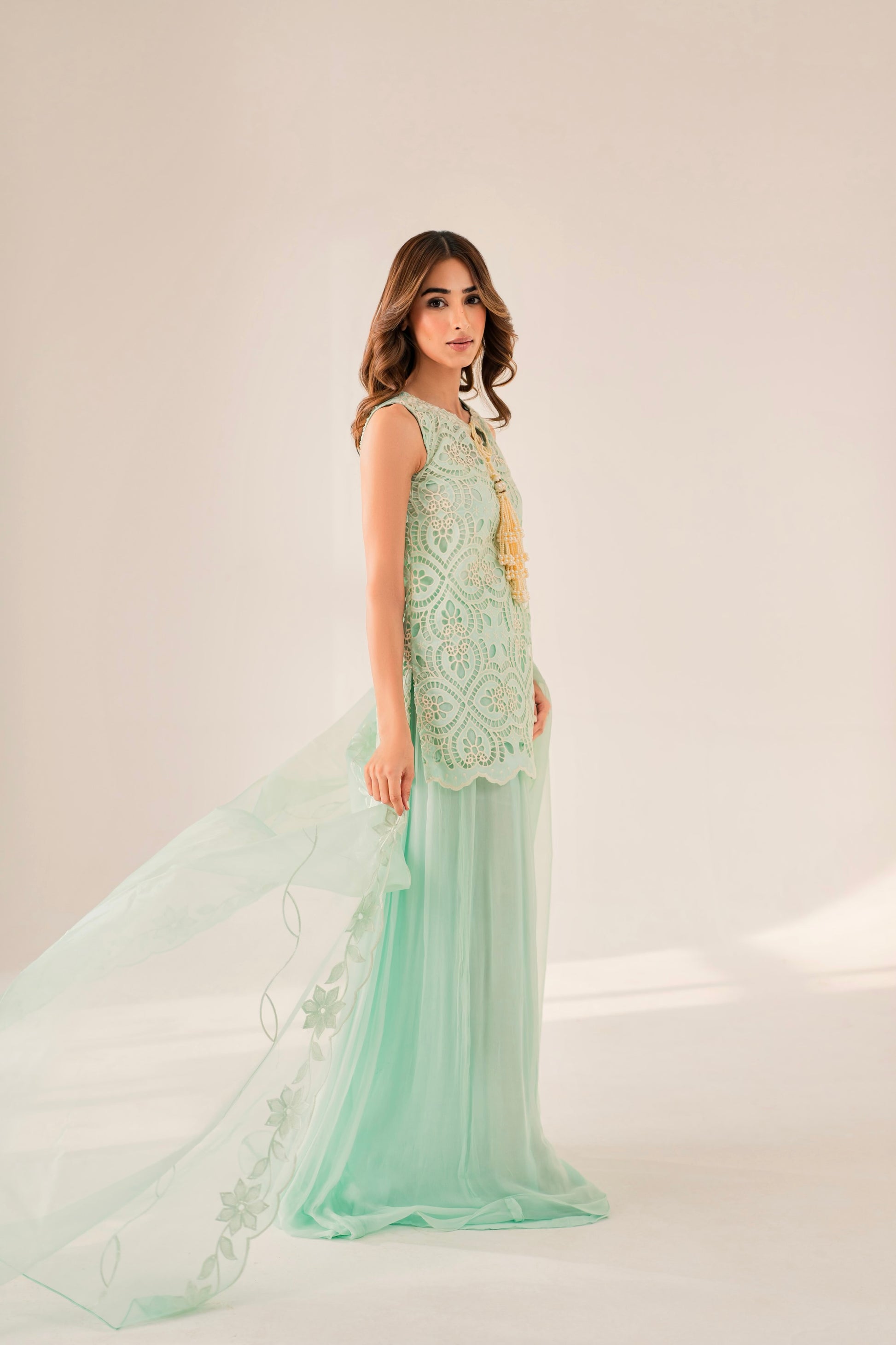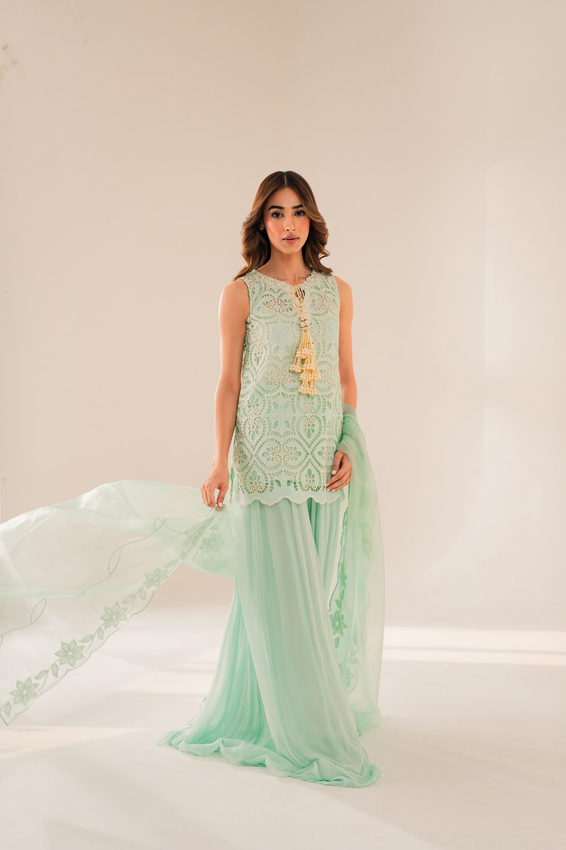 This outfit is beautifully hand crafted by our designer’s. The chikankari cutwork shirt is complete with customised lace and finished with a lovely cutwork embroided dupatta with our free flowing silk sharara pants. It is the perfect set to keep you comfortable this festive season.