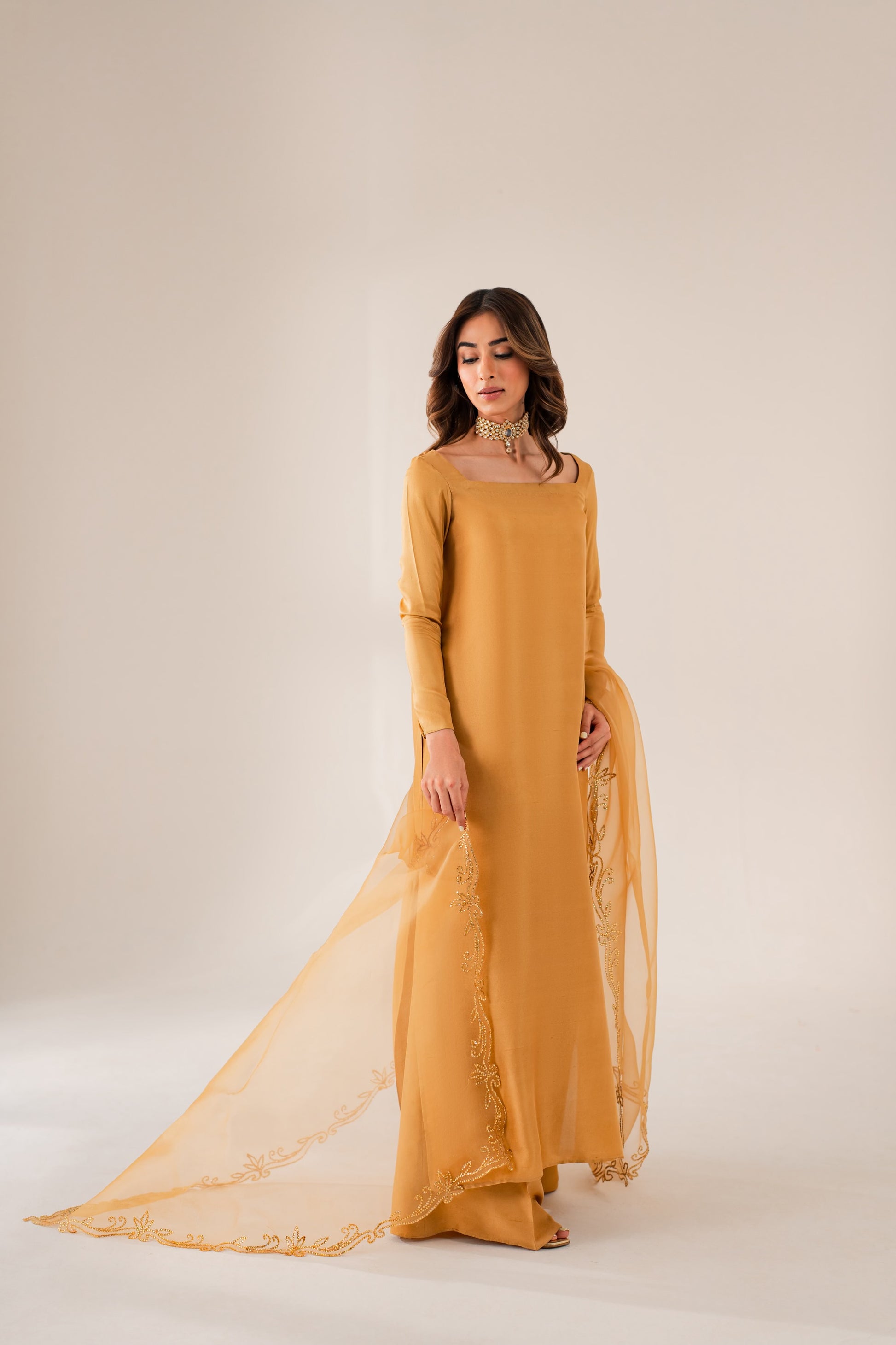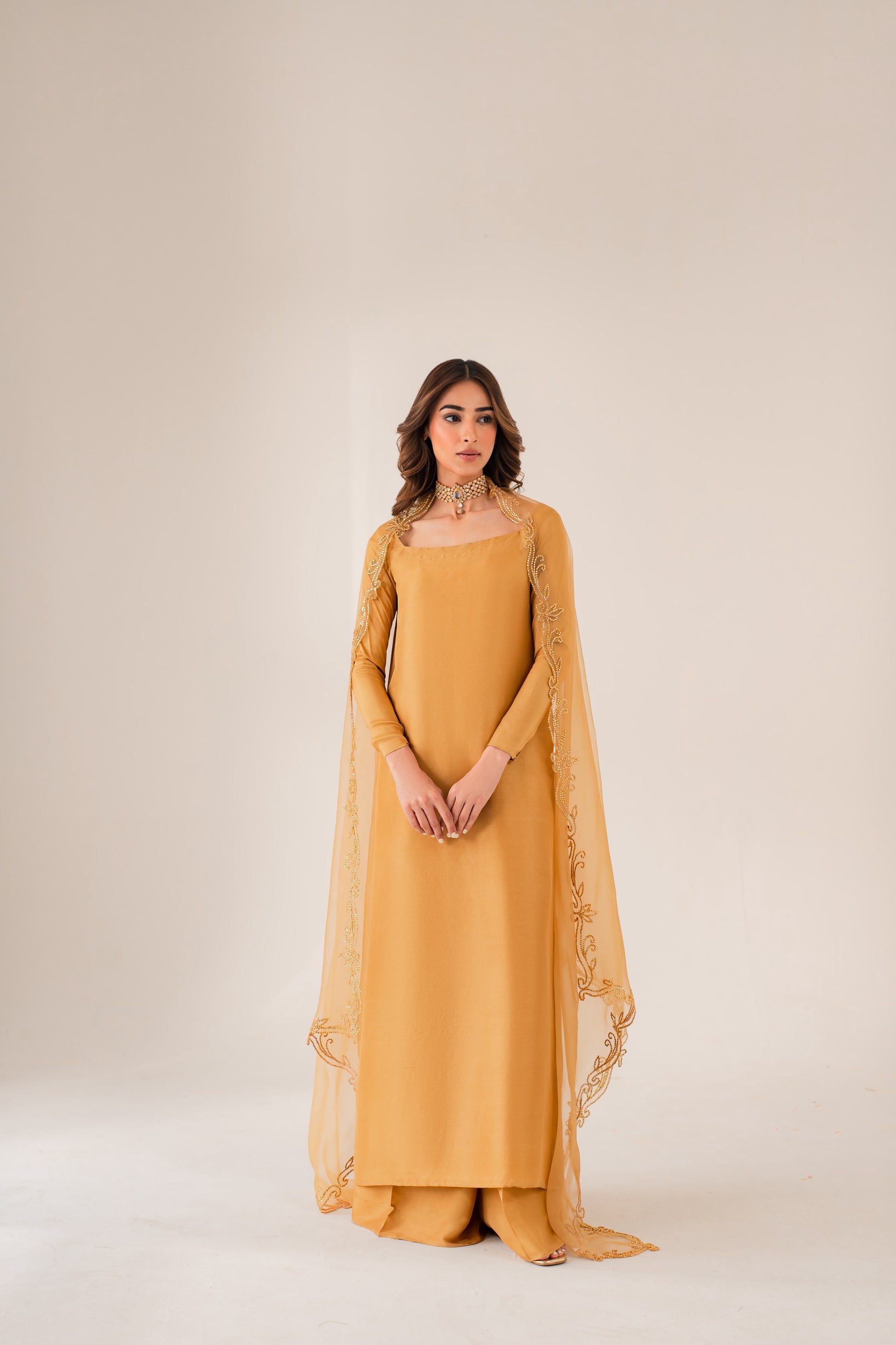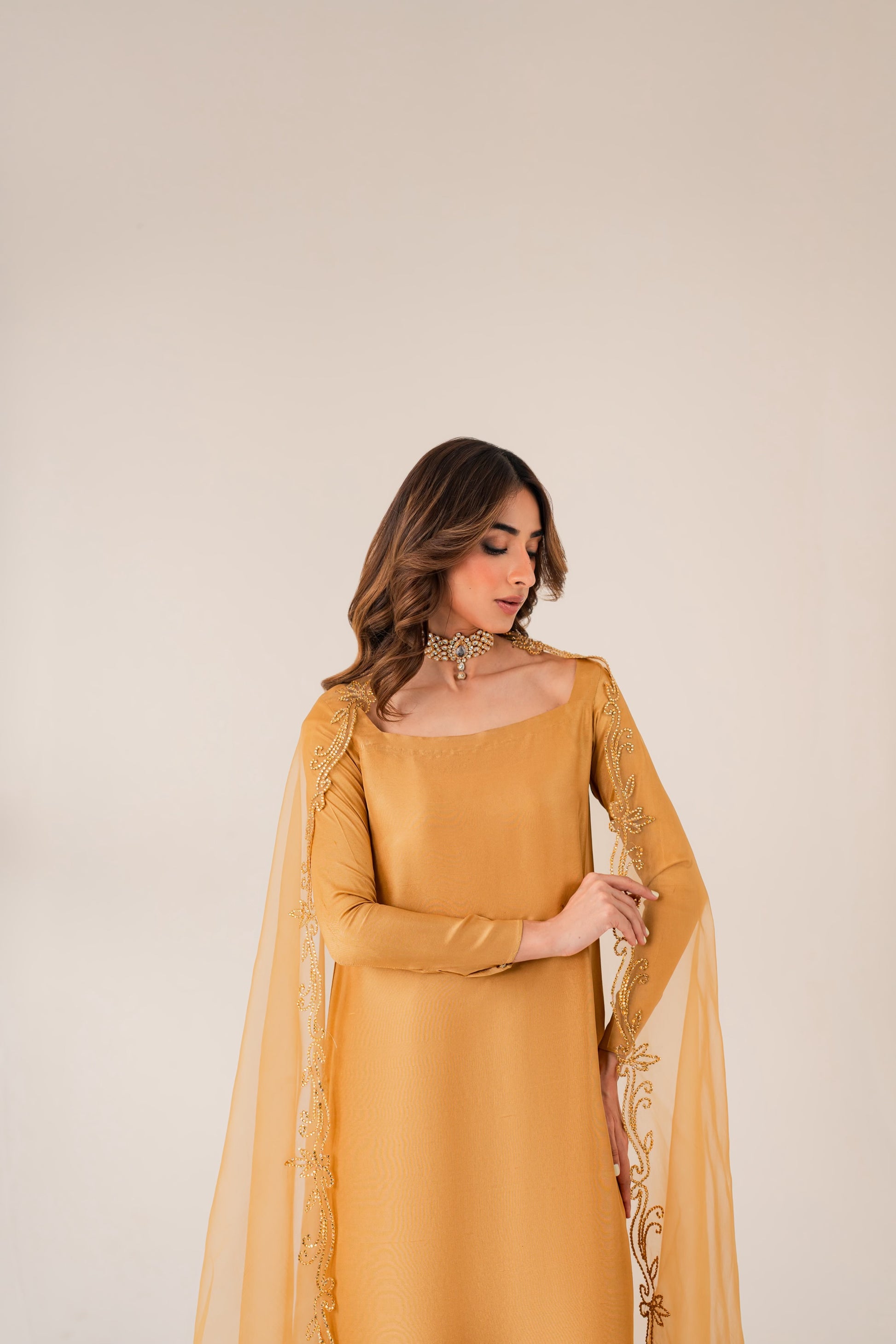 Crafted on a luxurious canvas of a beautiful shade of gold paired with fully handworked pure organza duppatta, “The Kai Set” is the perfect choice for any occasion.