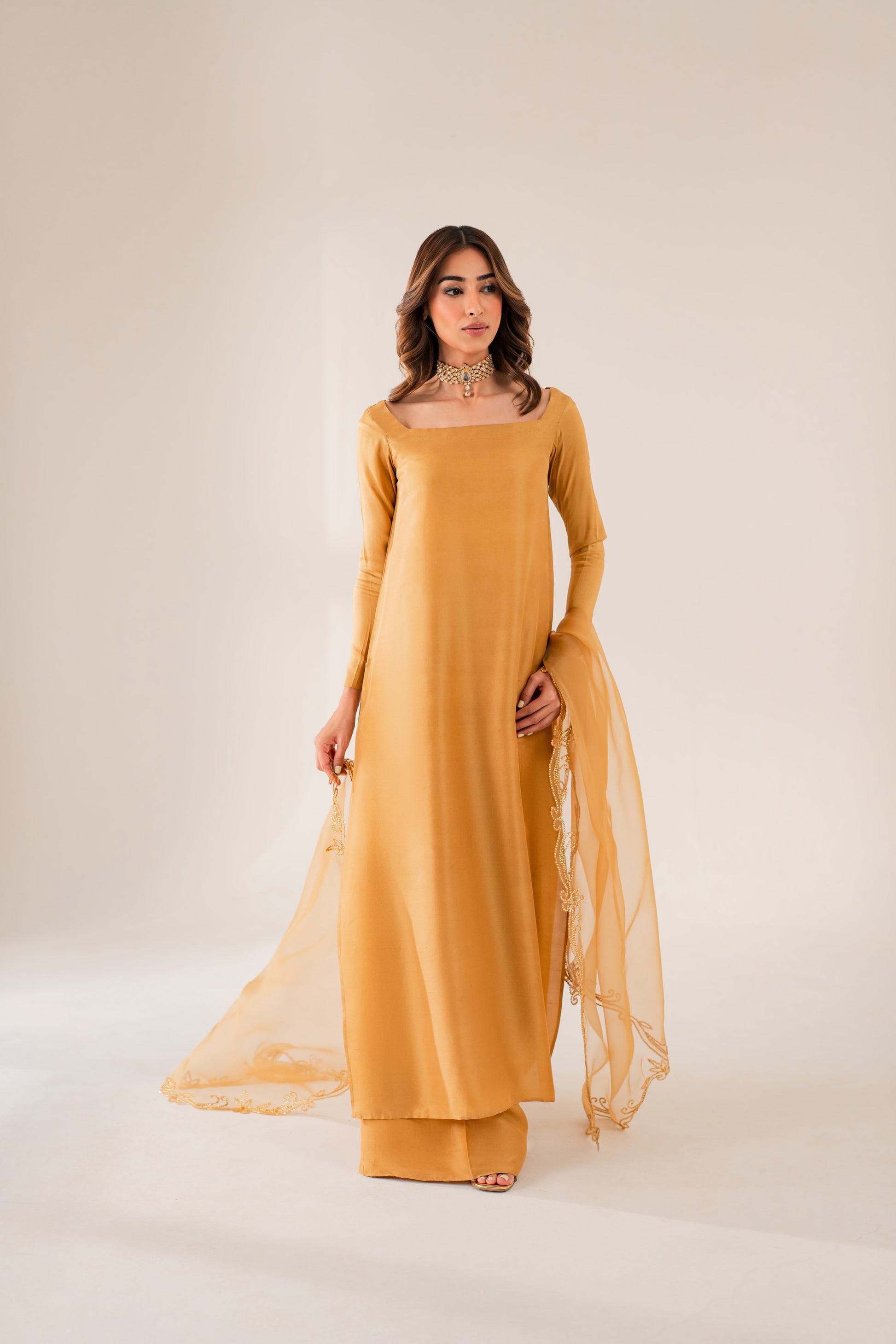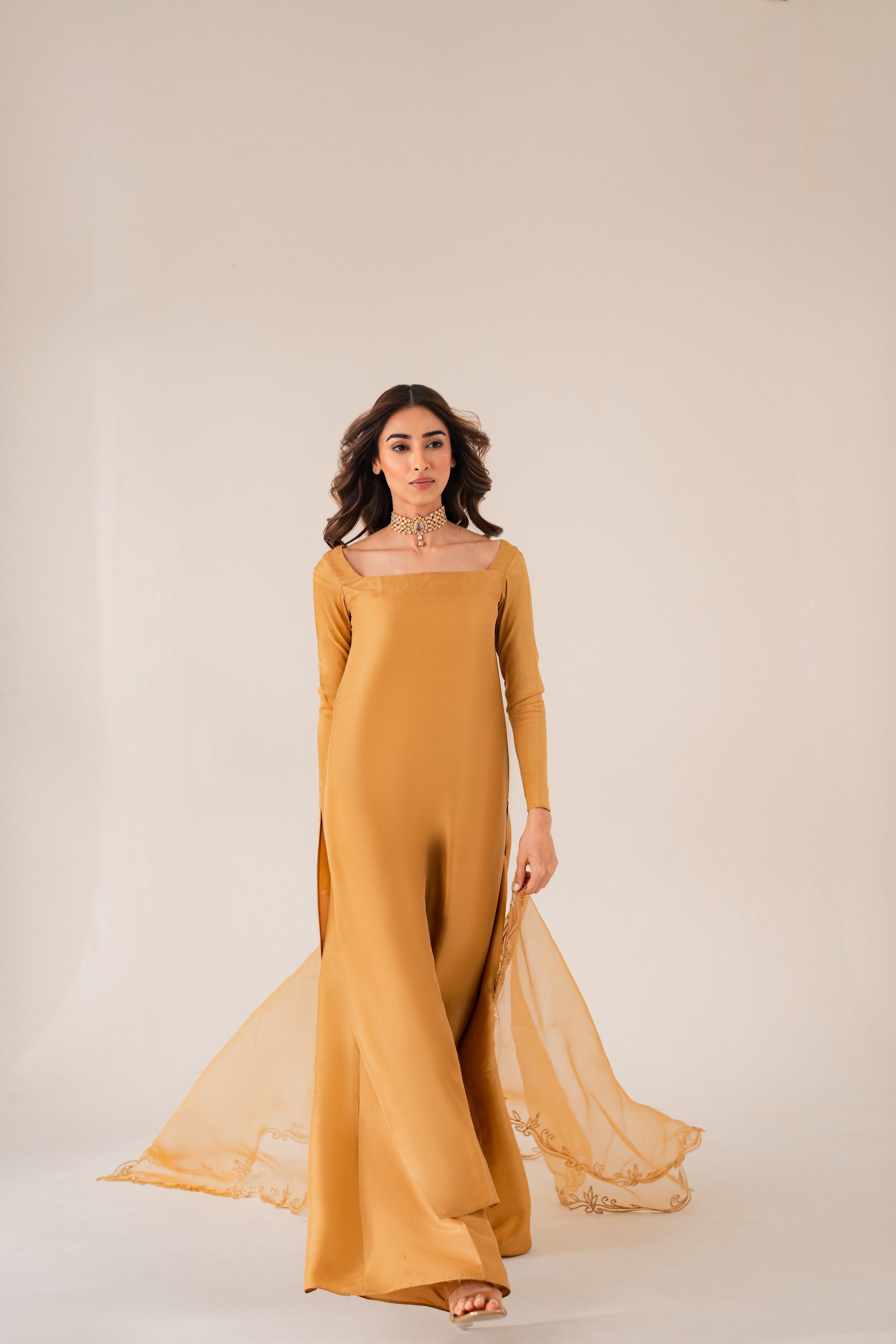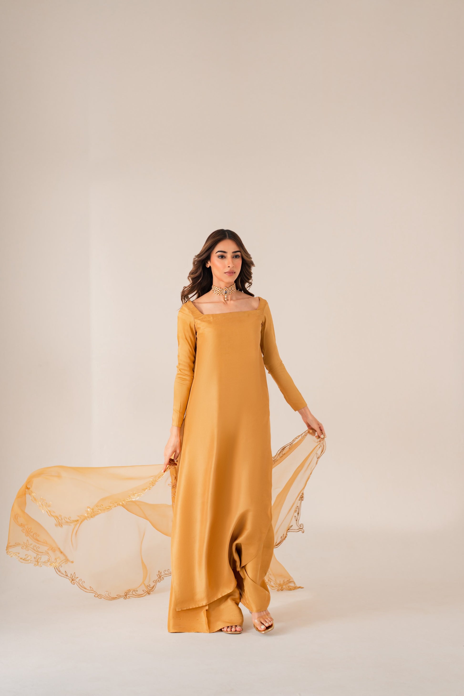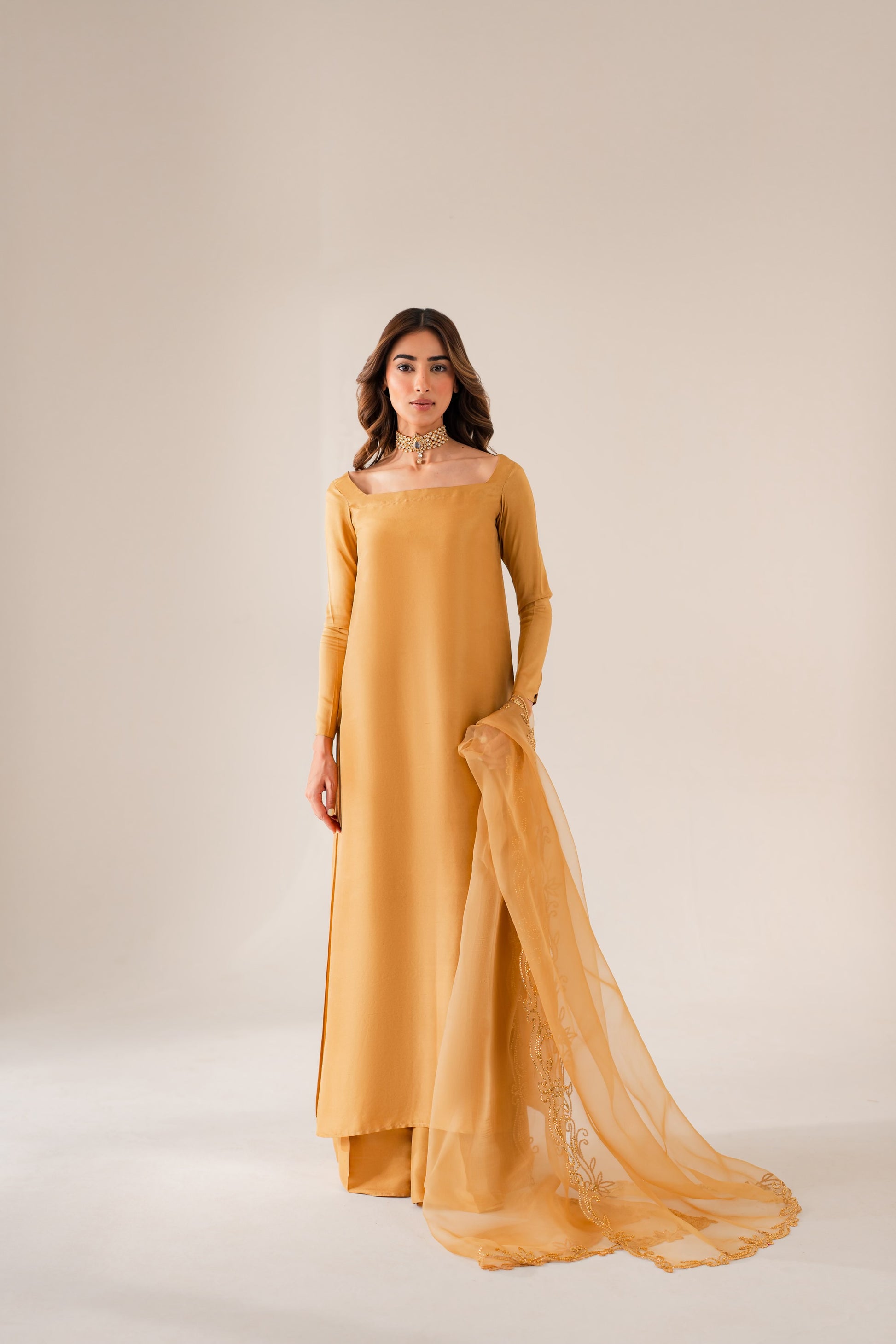 Crafted on a luxurious canvas of a beautiful shade of gold paired with fully handworked pure organza duppatta, “The Kai Set” is the perfect choice for any occasion.