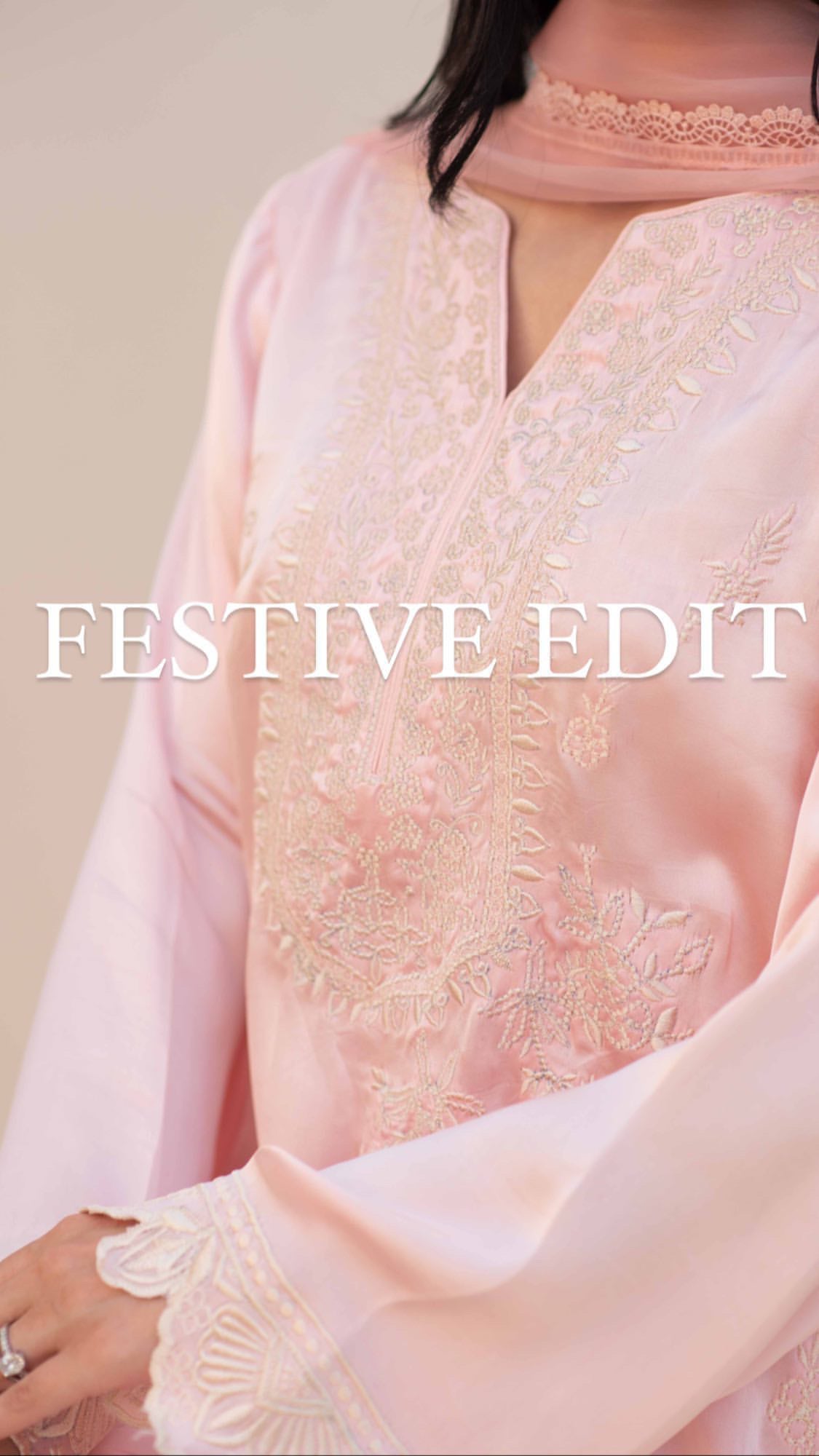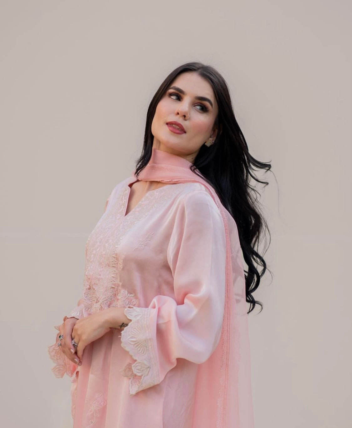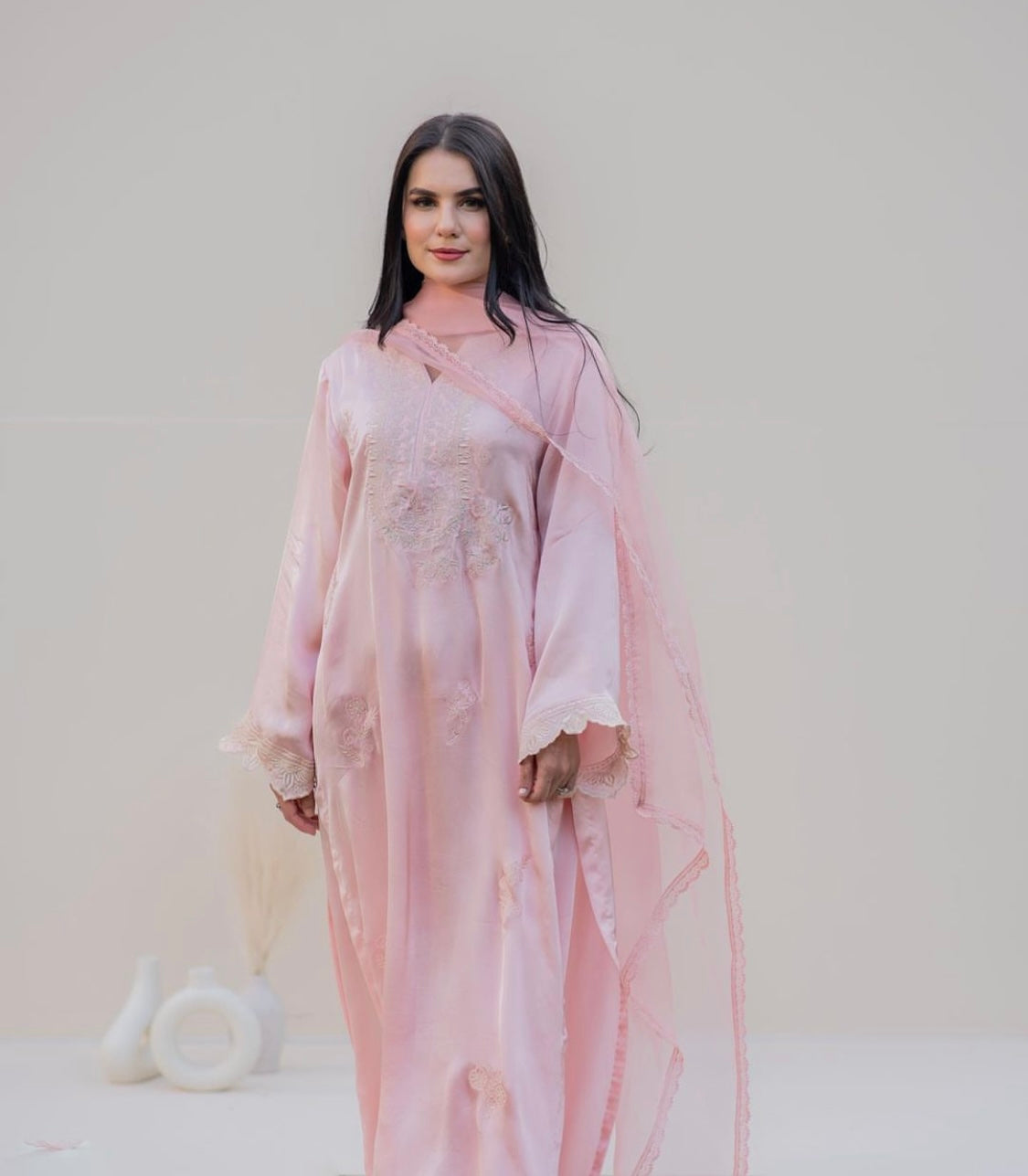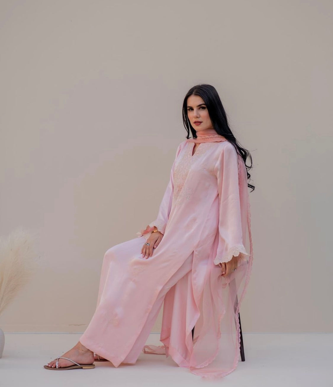 Dainty florals are laid out in "Kyrah" featuring with a delicately embroidered neckline and embroidered sleeves. Offset on a soothing shade of soft pink, Kyrah is completed with matching pants and duppatta finished with lace detailing.