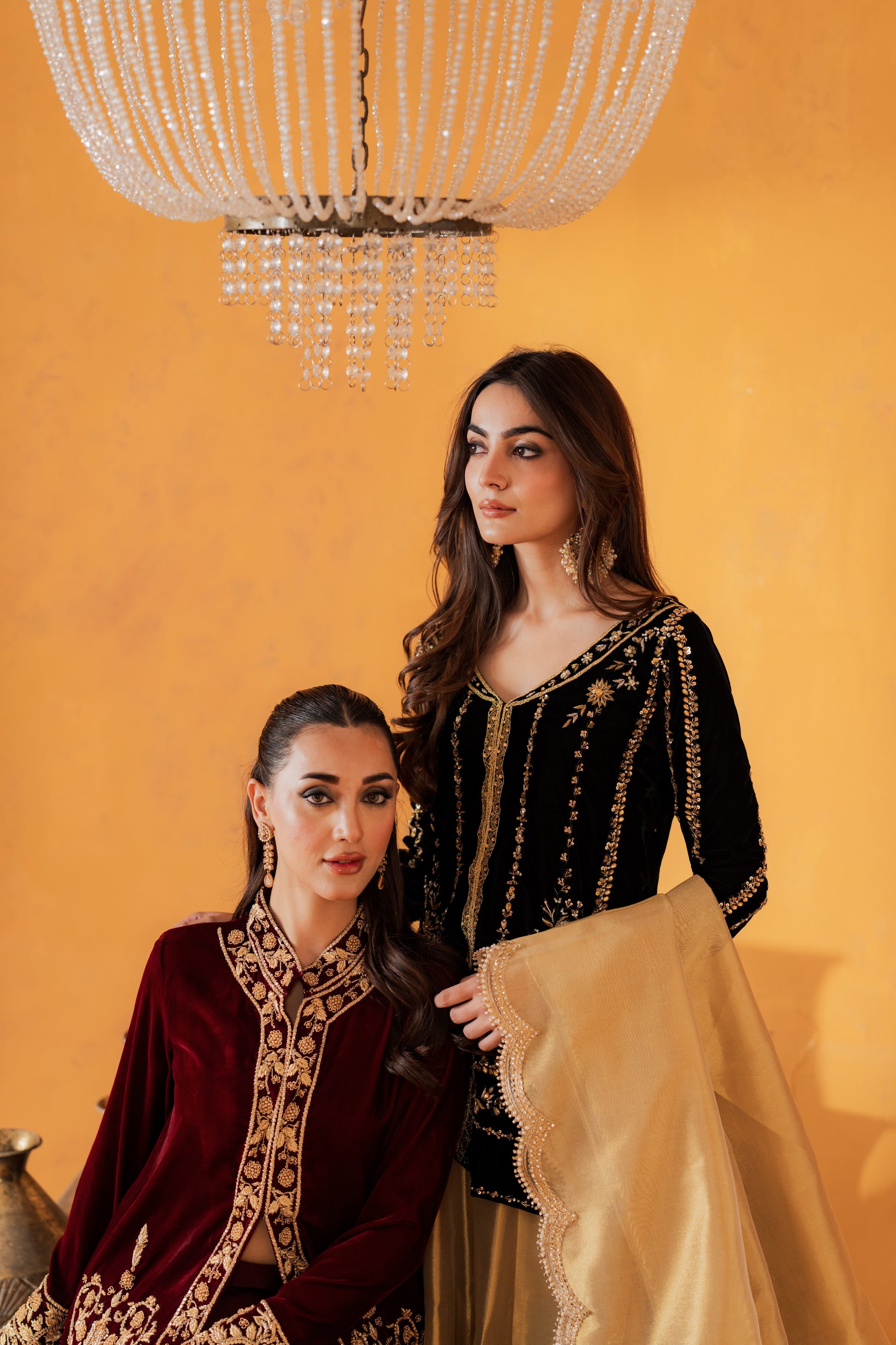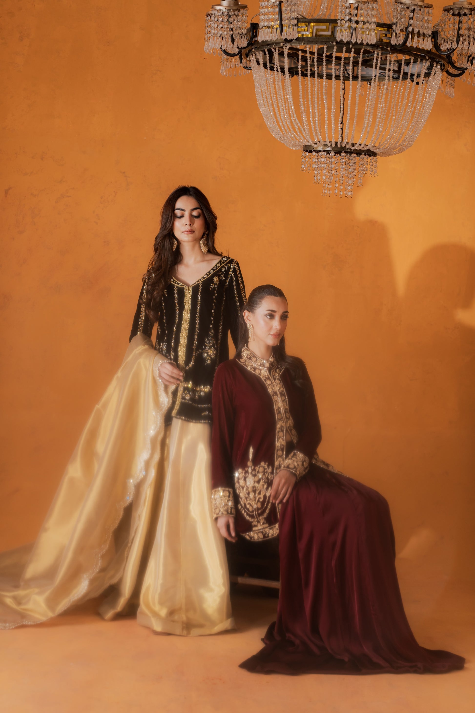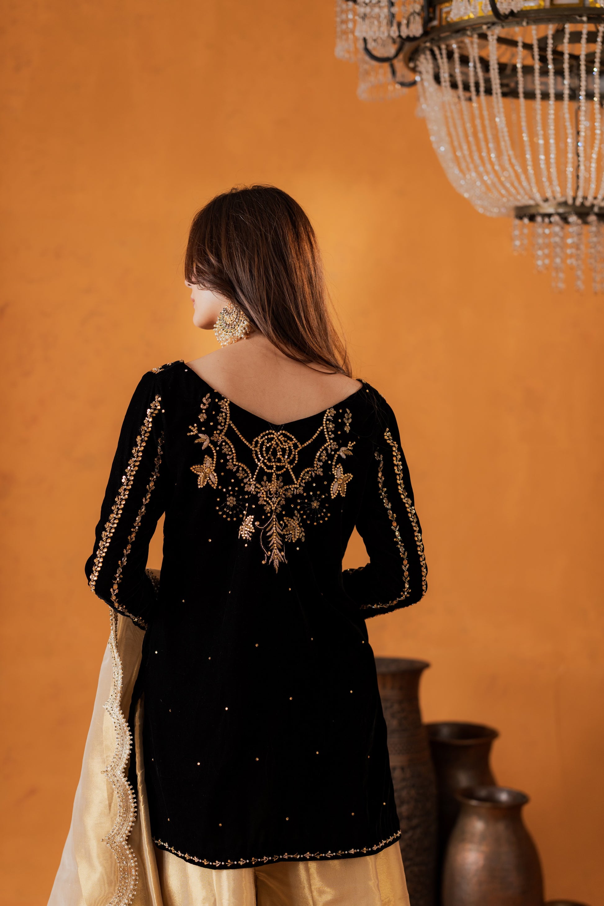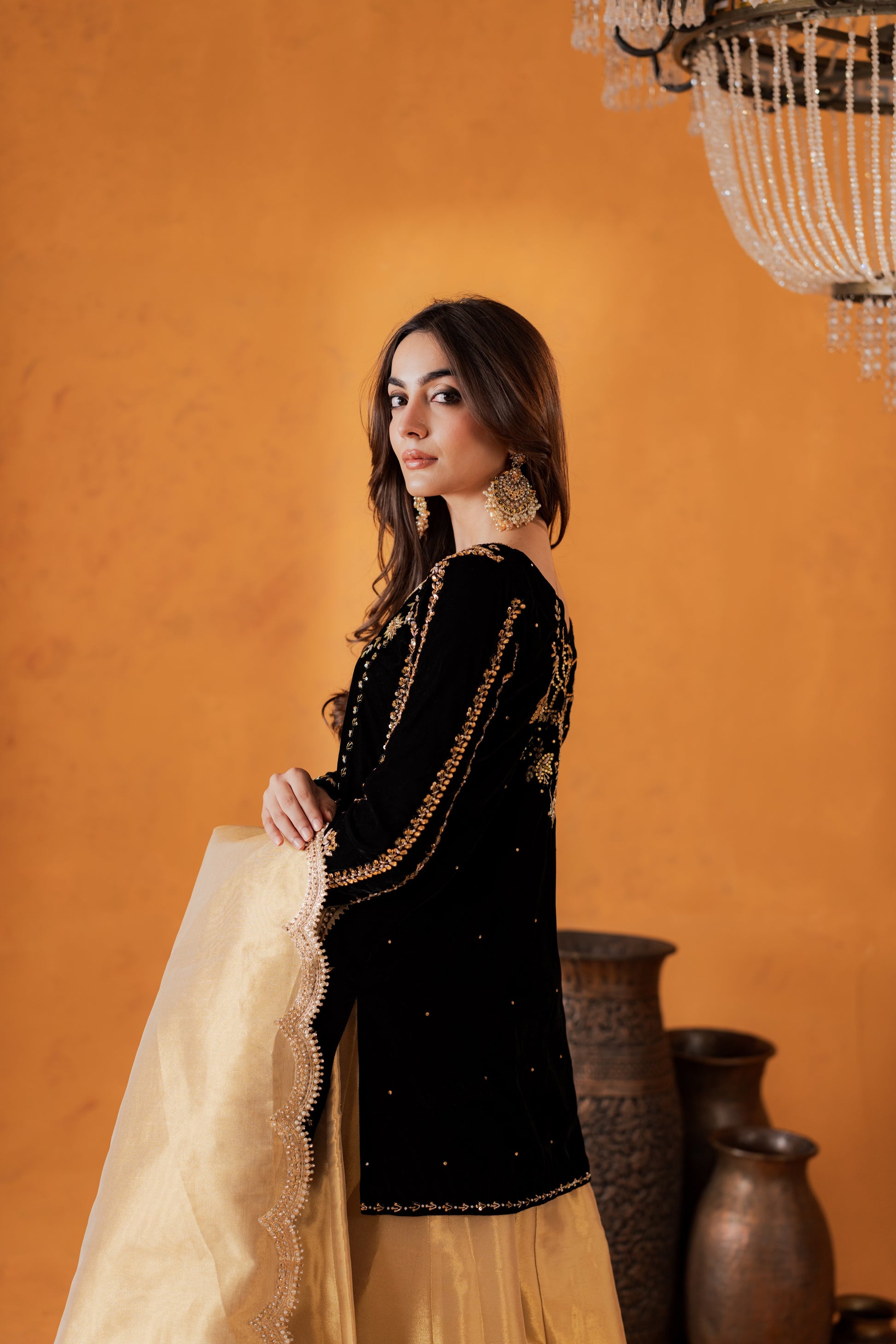 Lumé — handcrafted on rich black velvet, adorned with intricate dabka and zardozi work, paired with pure tissue silk pants. A whimsical dream woven for the wedding season.