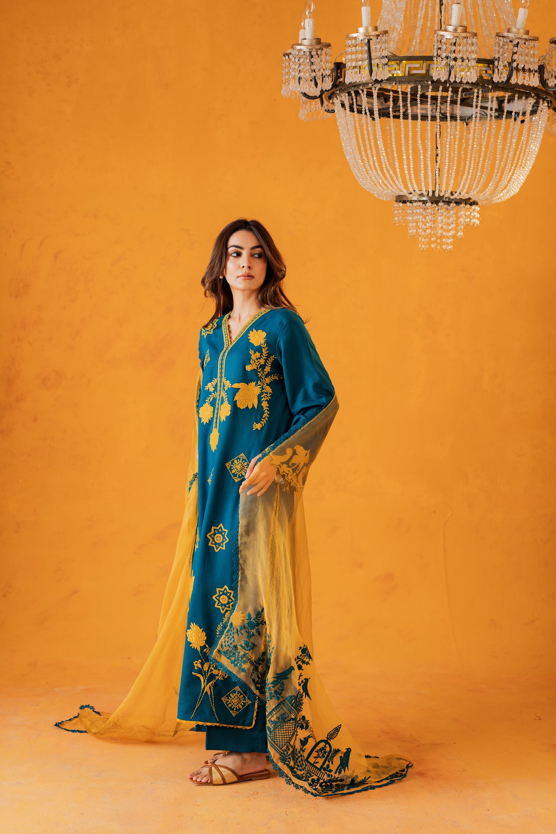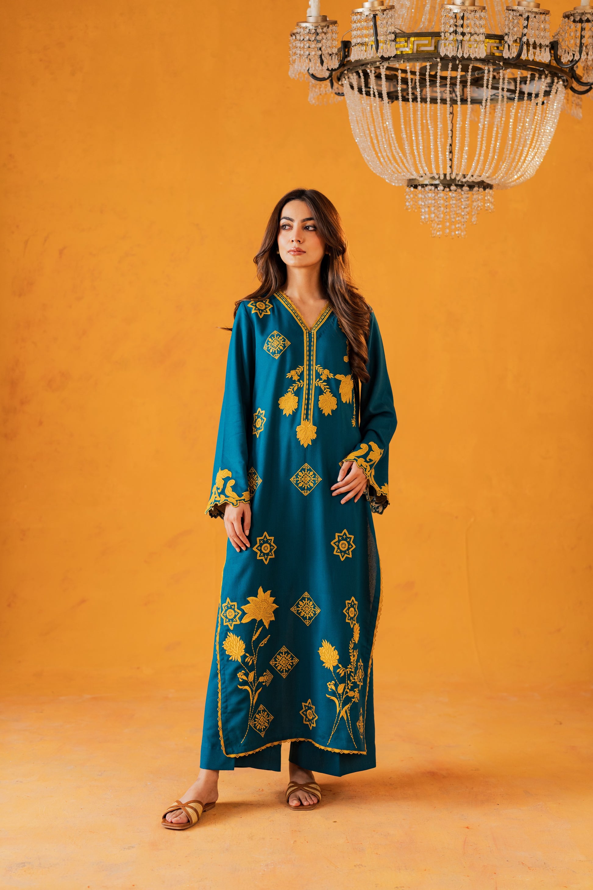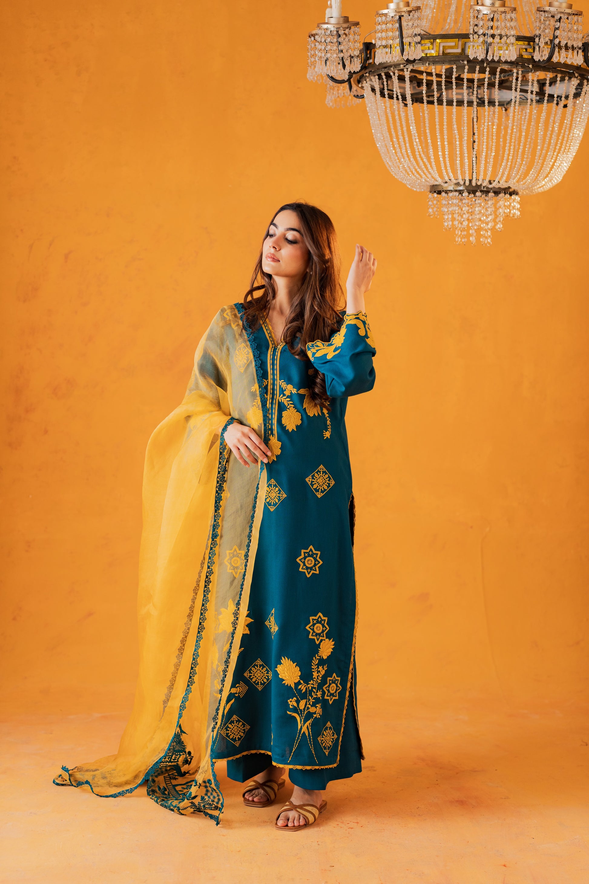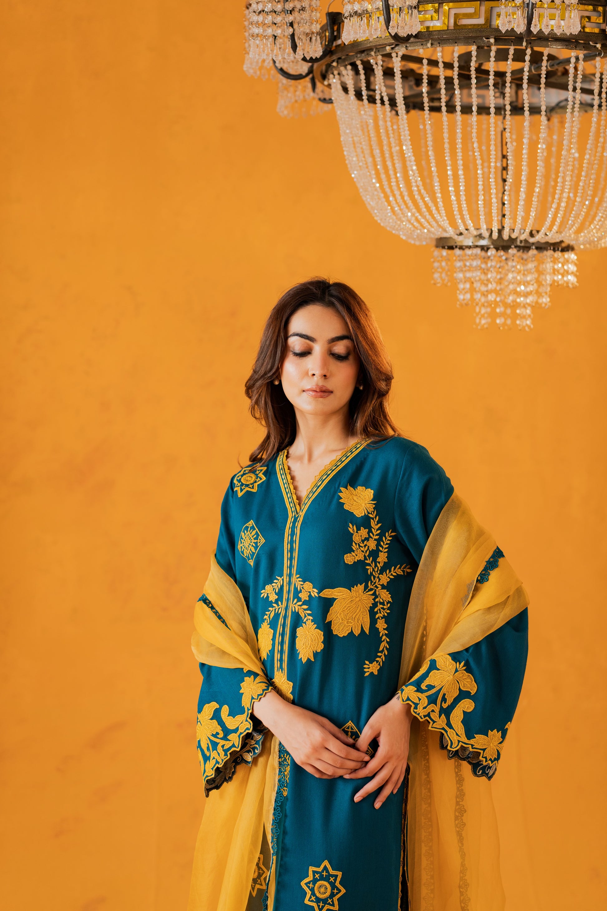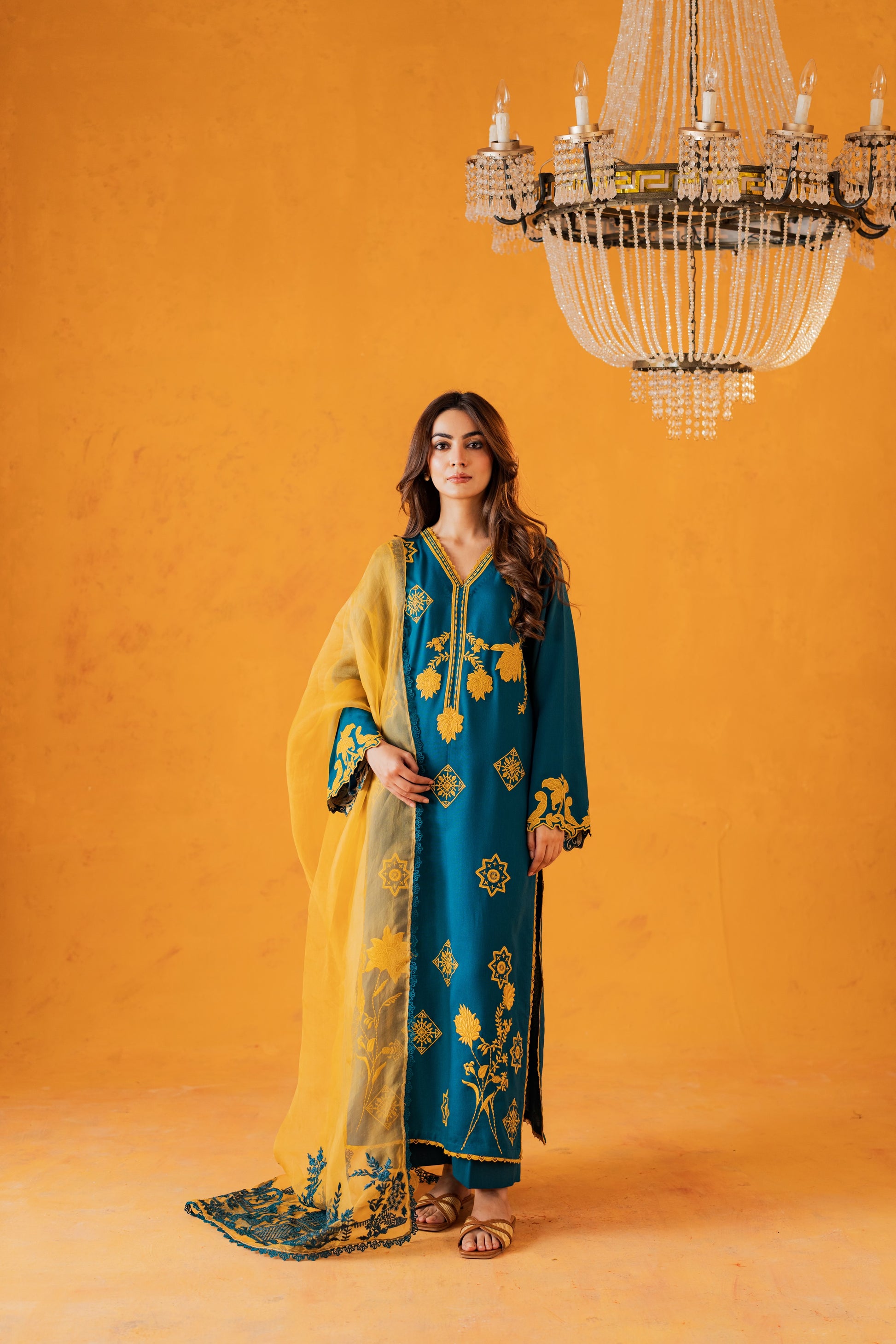 Make way for “Cleo” — a vibrant fusion of teal and mustard, wrapped in warmth and elegance. Featuring a fully embroidered shirt paired with matching pants and a contrasting organza duppatta with exquisite abstract embroidery, “Cleo” is the ultimate statement for winter days ahead.