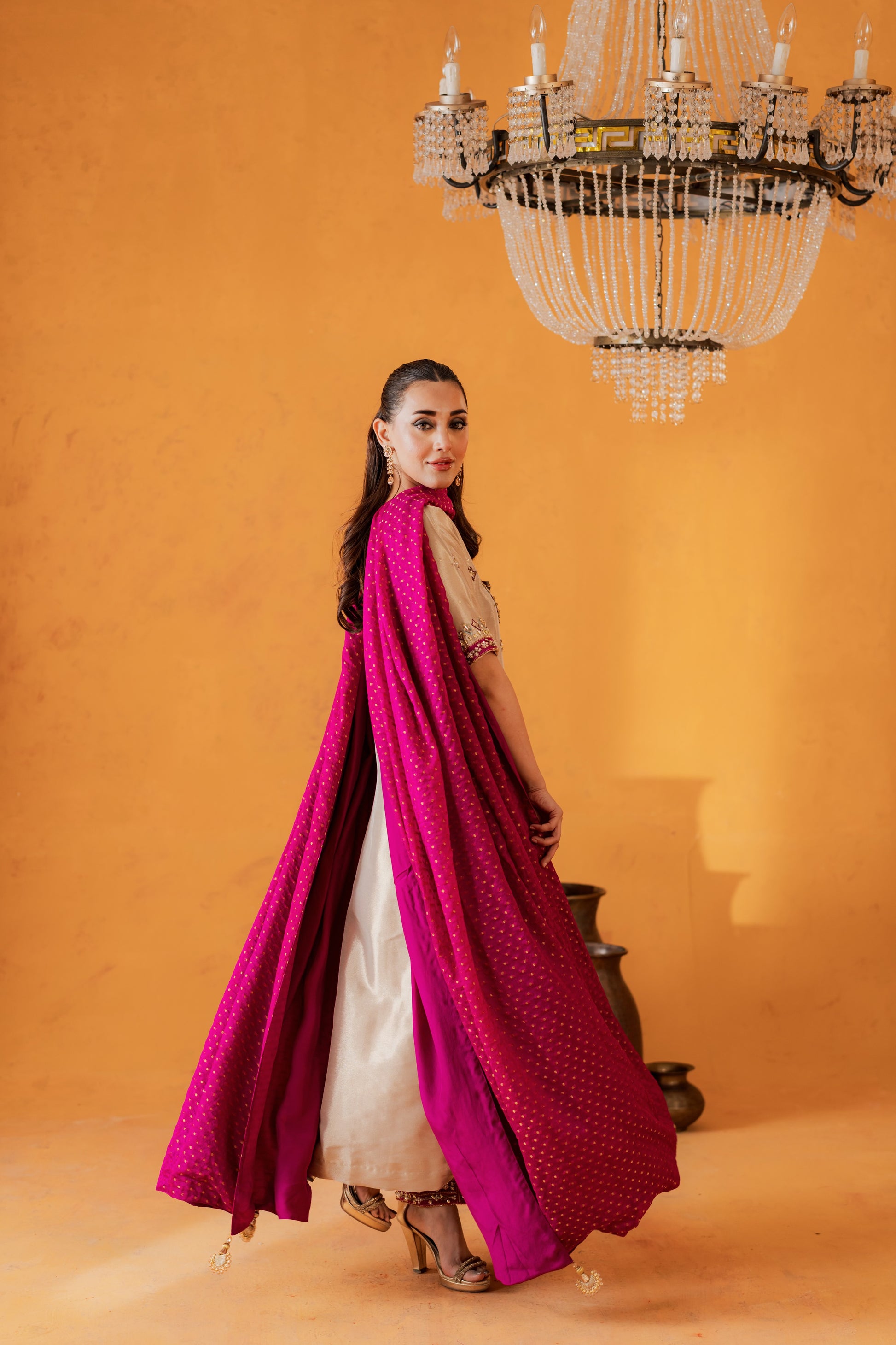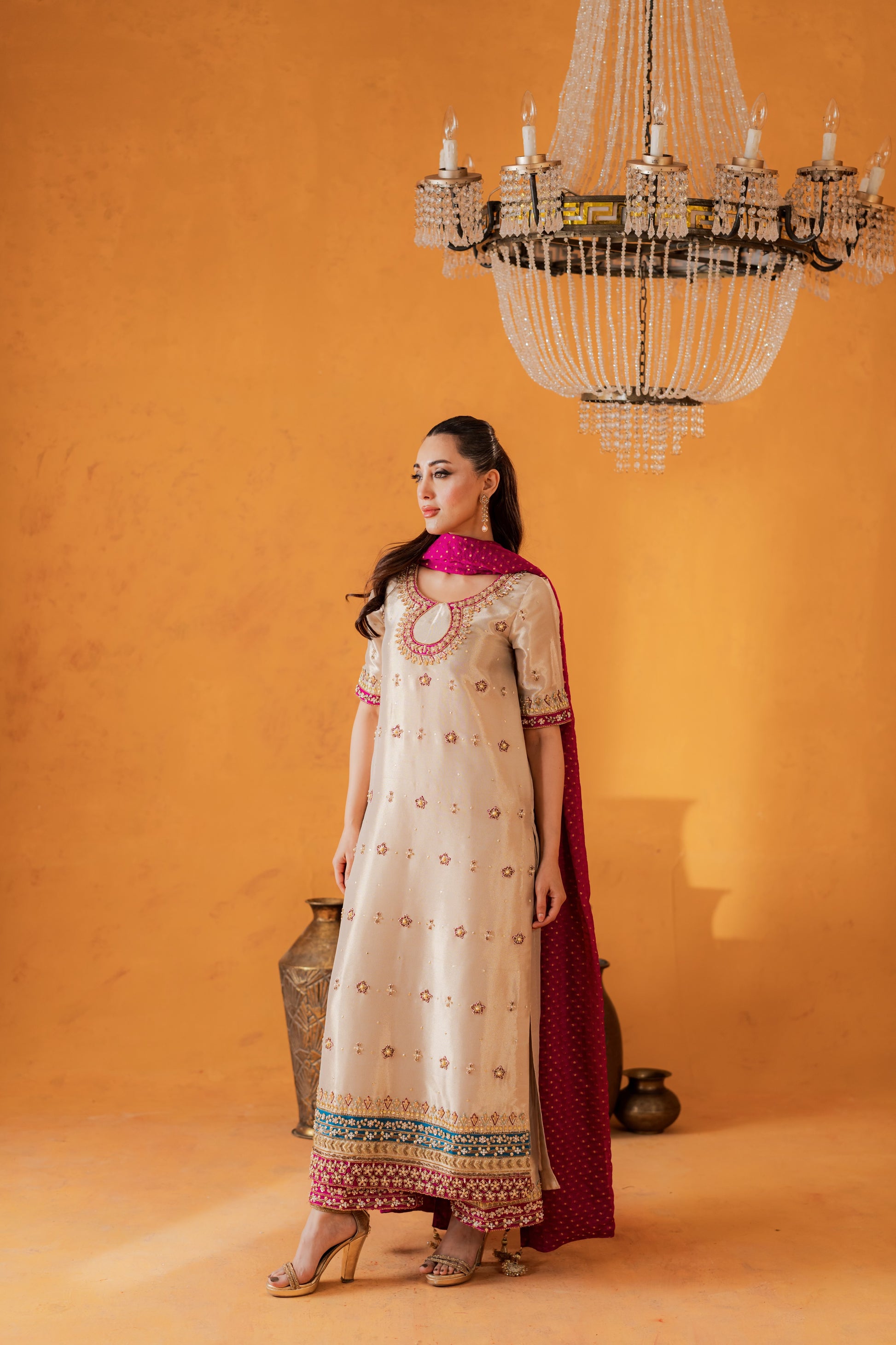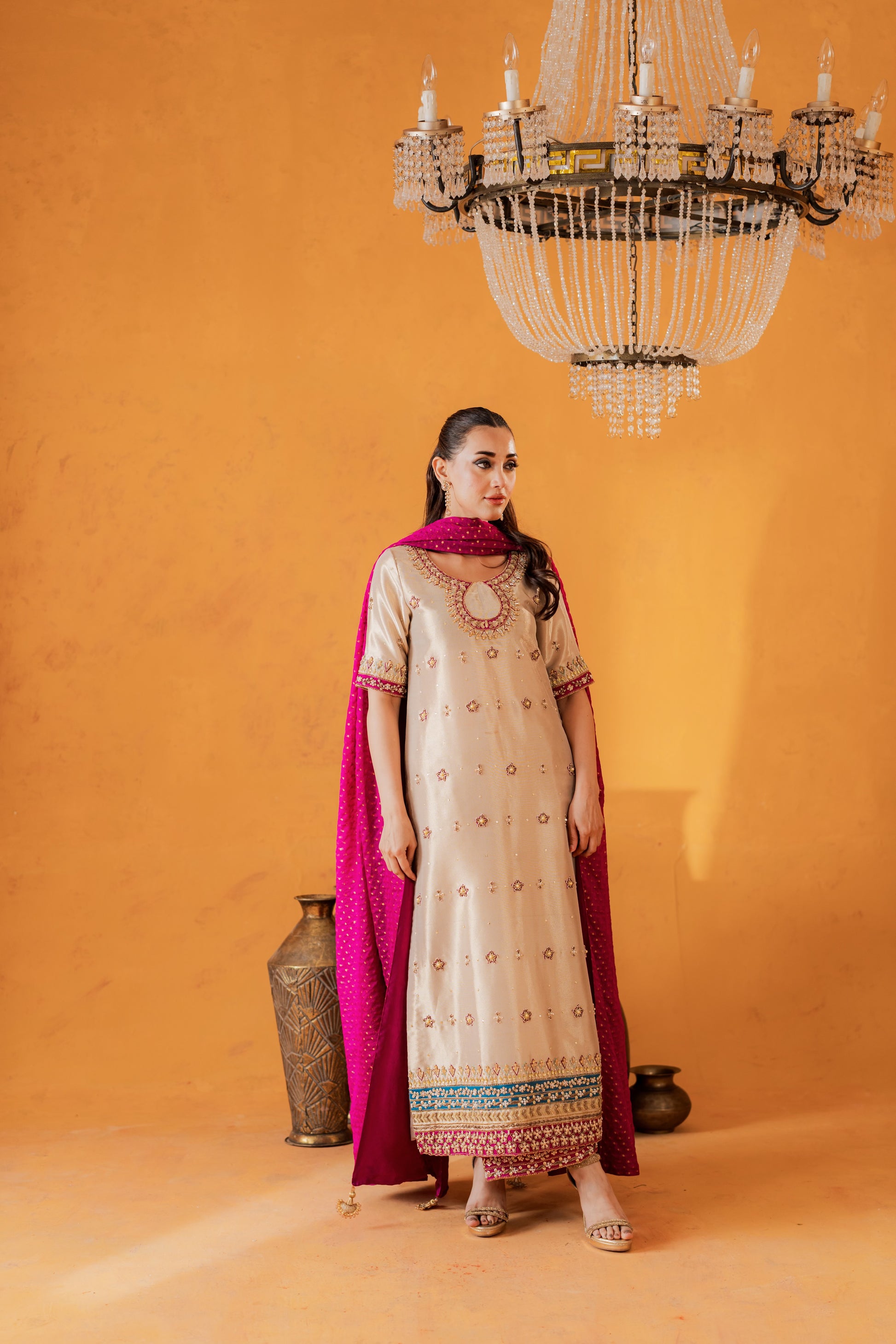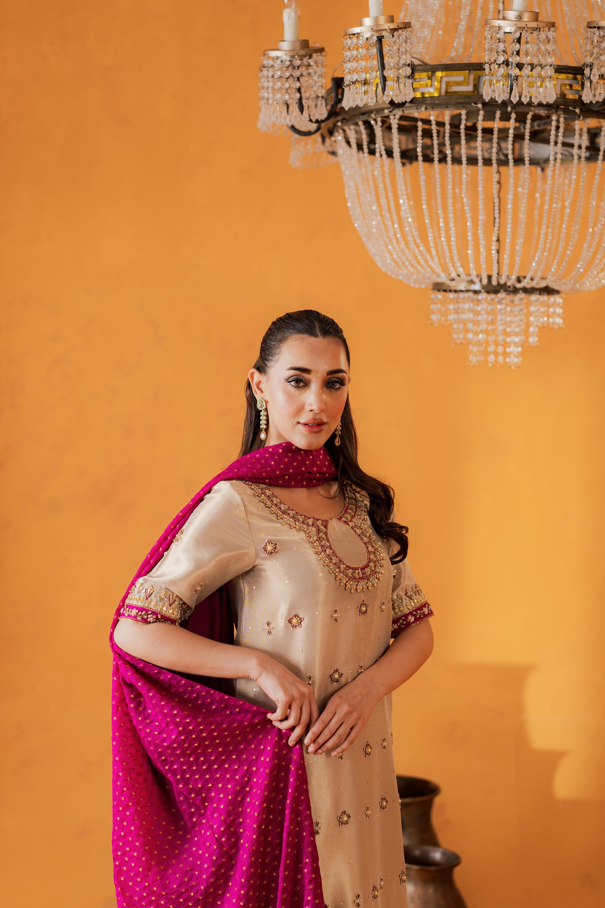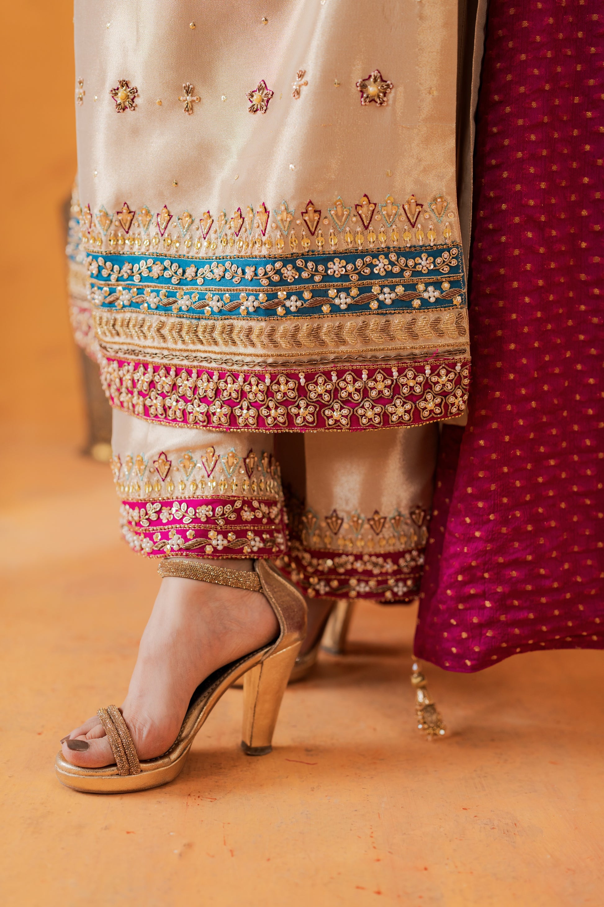 Crafted on a shimmering canvas of gold tissue silk, this handcrafted formal ensemble dazzles with intricate dabka, zardozi, and stonework that adorn the front, sleeves, and pants with unmatched artistry. A breathtaking blend of vibrant teal and magenta hues breathes life into Nysa, making it the ultimate showstopper for this wedding season.