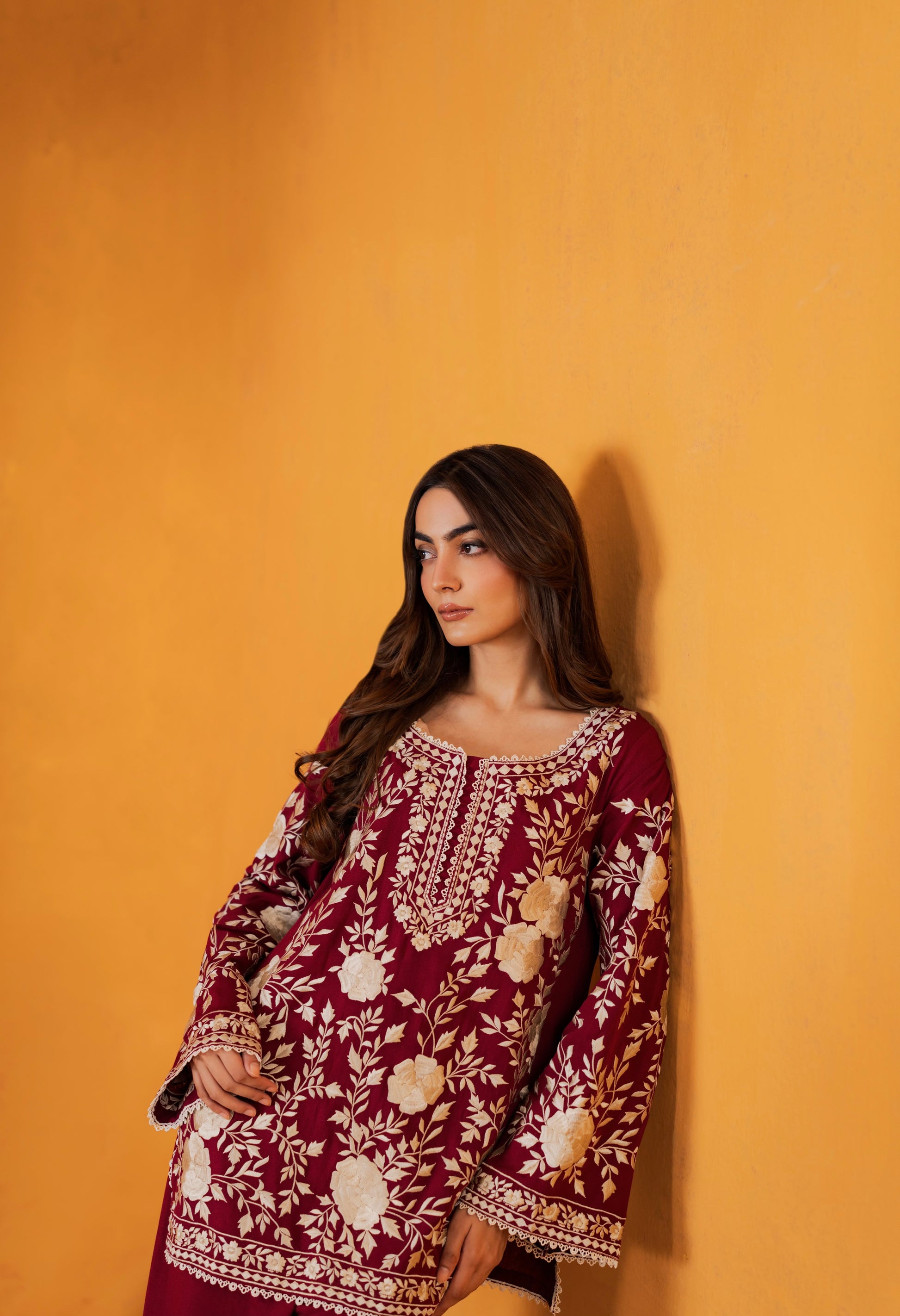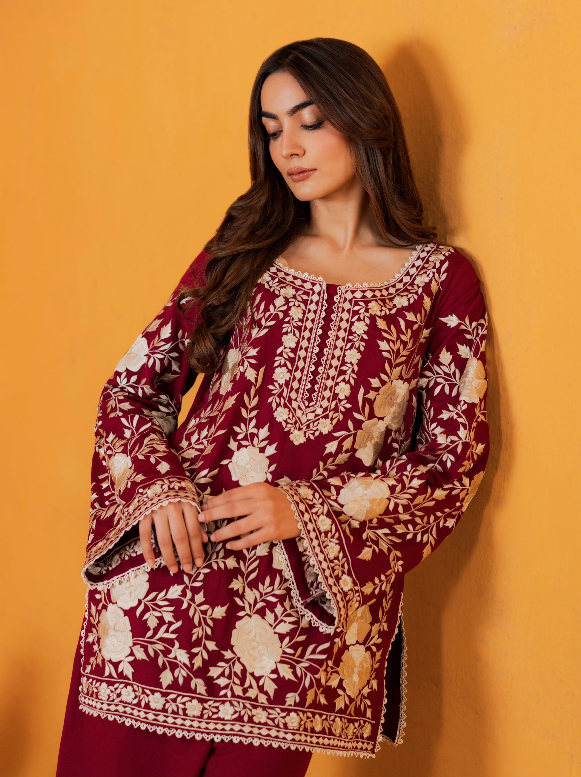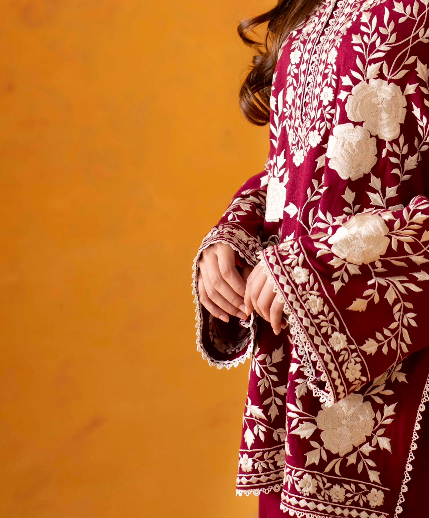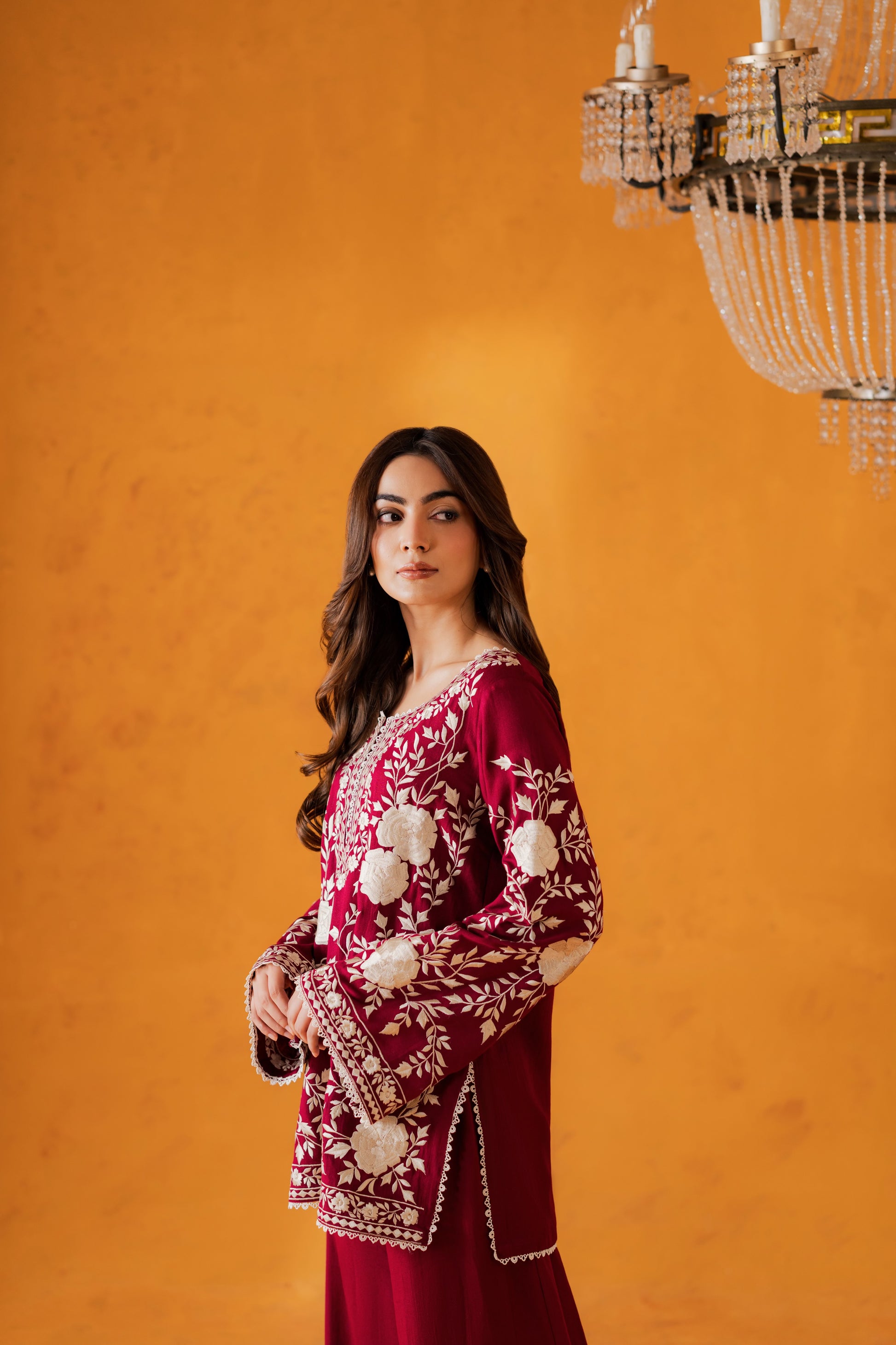 Draped in a rich maroon hue, this fully embroidered ensemble is your go-to for crisp fall days and cozy winter nights. From casual strolls to candlelit dinners, Vera turns every moment into a statement.