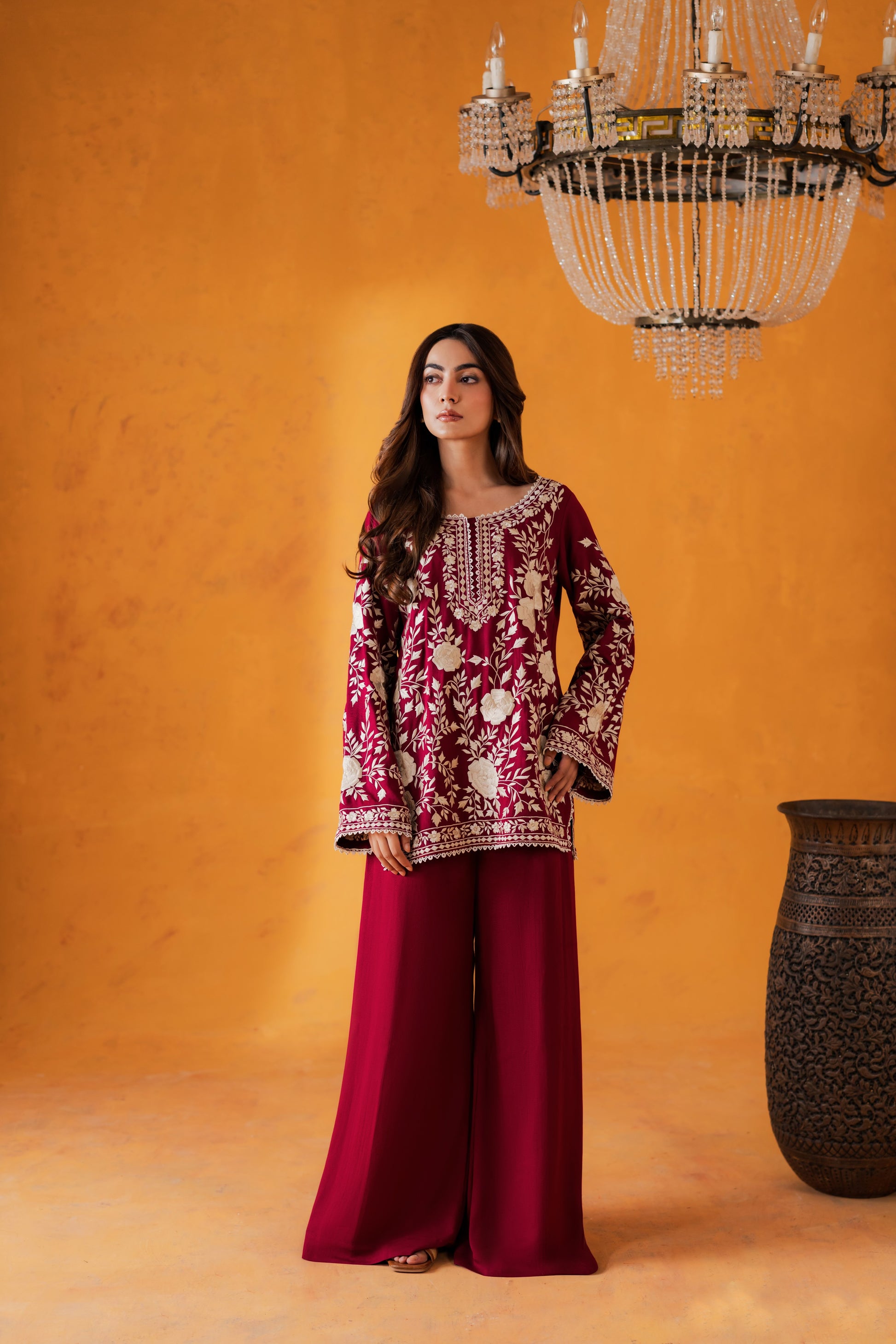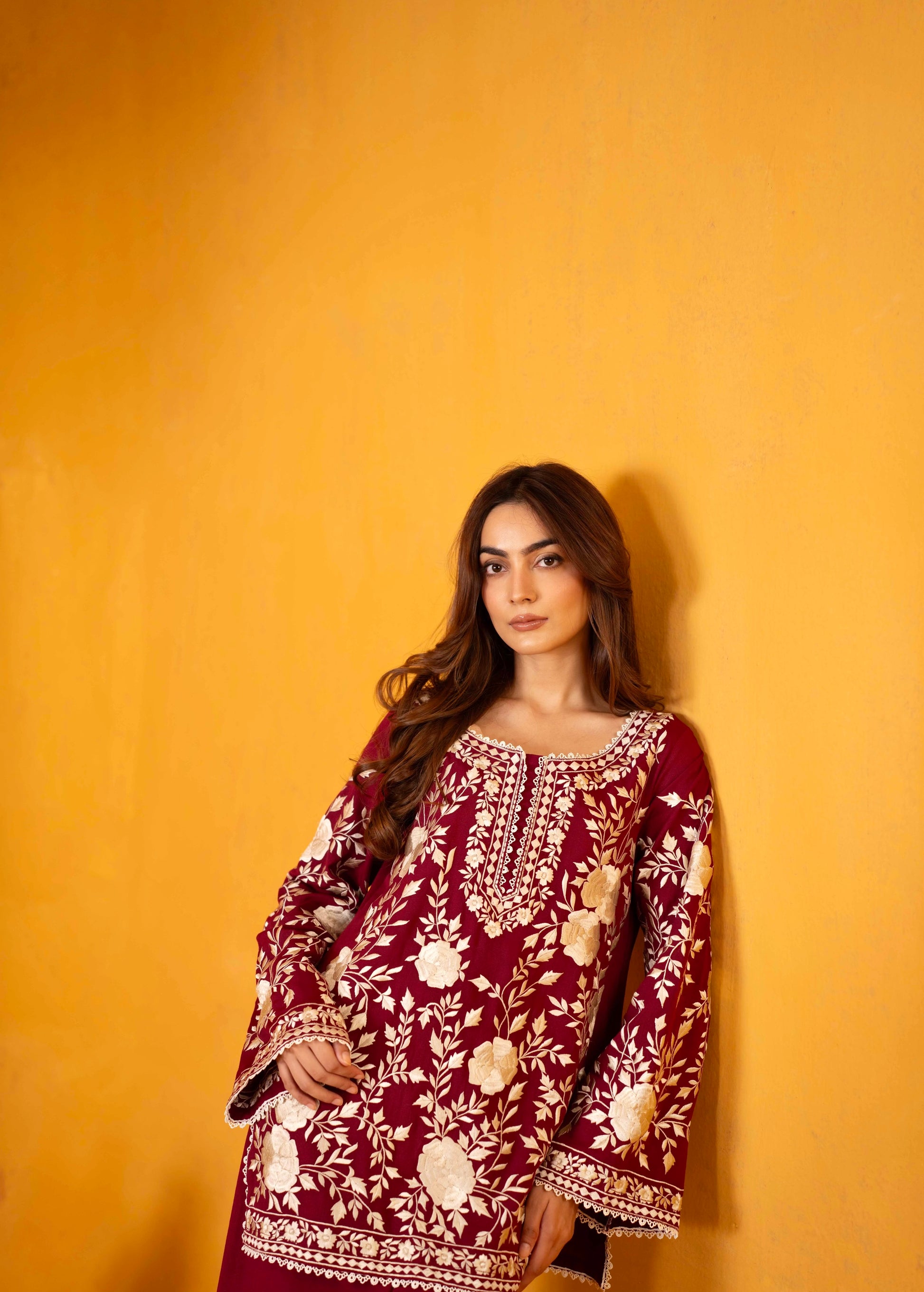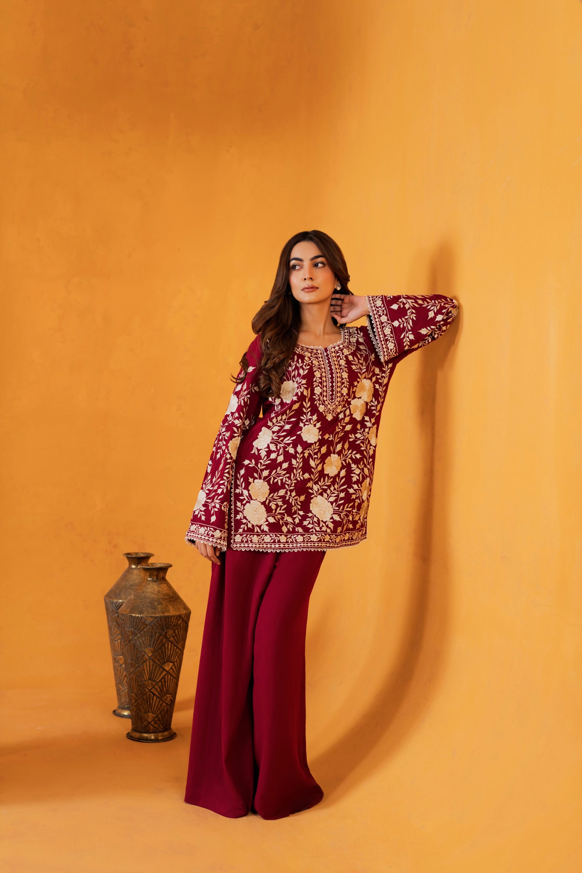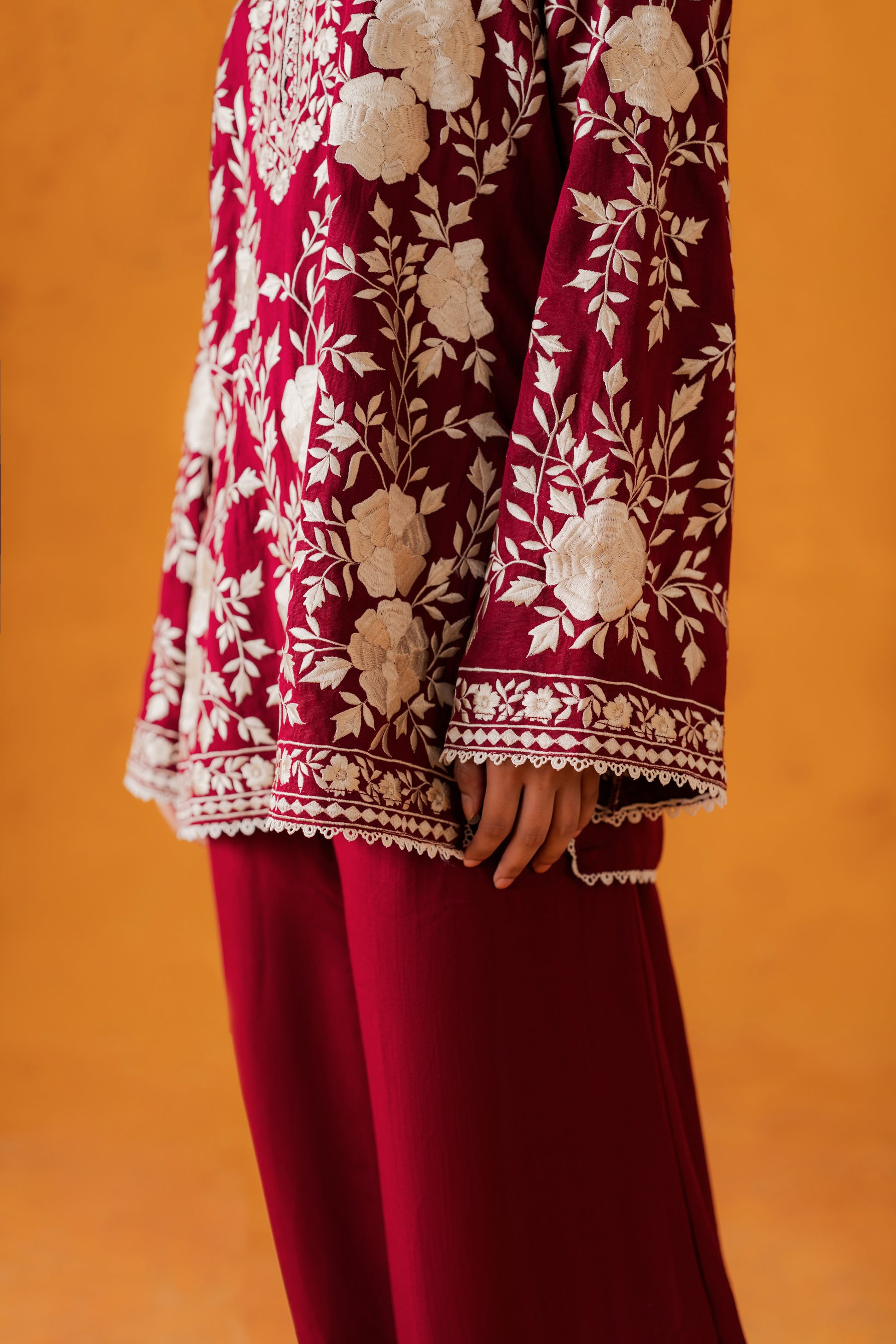 Draped in a rich maroon hue, this fully embroidered ensemble is your go-to for crisp fall days and cozy winter nights. From casual strolls to candlelit dinners, Vera turns every moment into a statement.